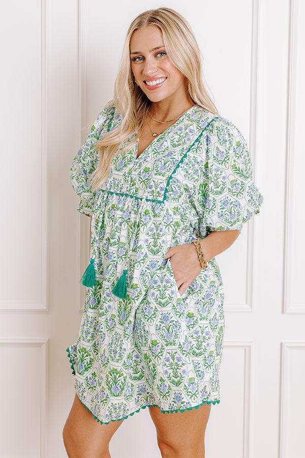 - It doesn't get any trendier than this darling mini dress! With its accent tassels and ricrac trim, this piece has all the cutest details. - Lightweight material with a floral print featuring different blue and green hues - A built-in lining - Green hued ricrac trim - A v-cut neckline with a tie detail featuring accent tassels - Puff sleeves - Functional side pockets - A relaxed silhouette that ends in a ricrac trimmed, mini dress length hemline