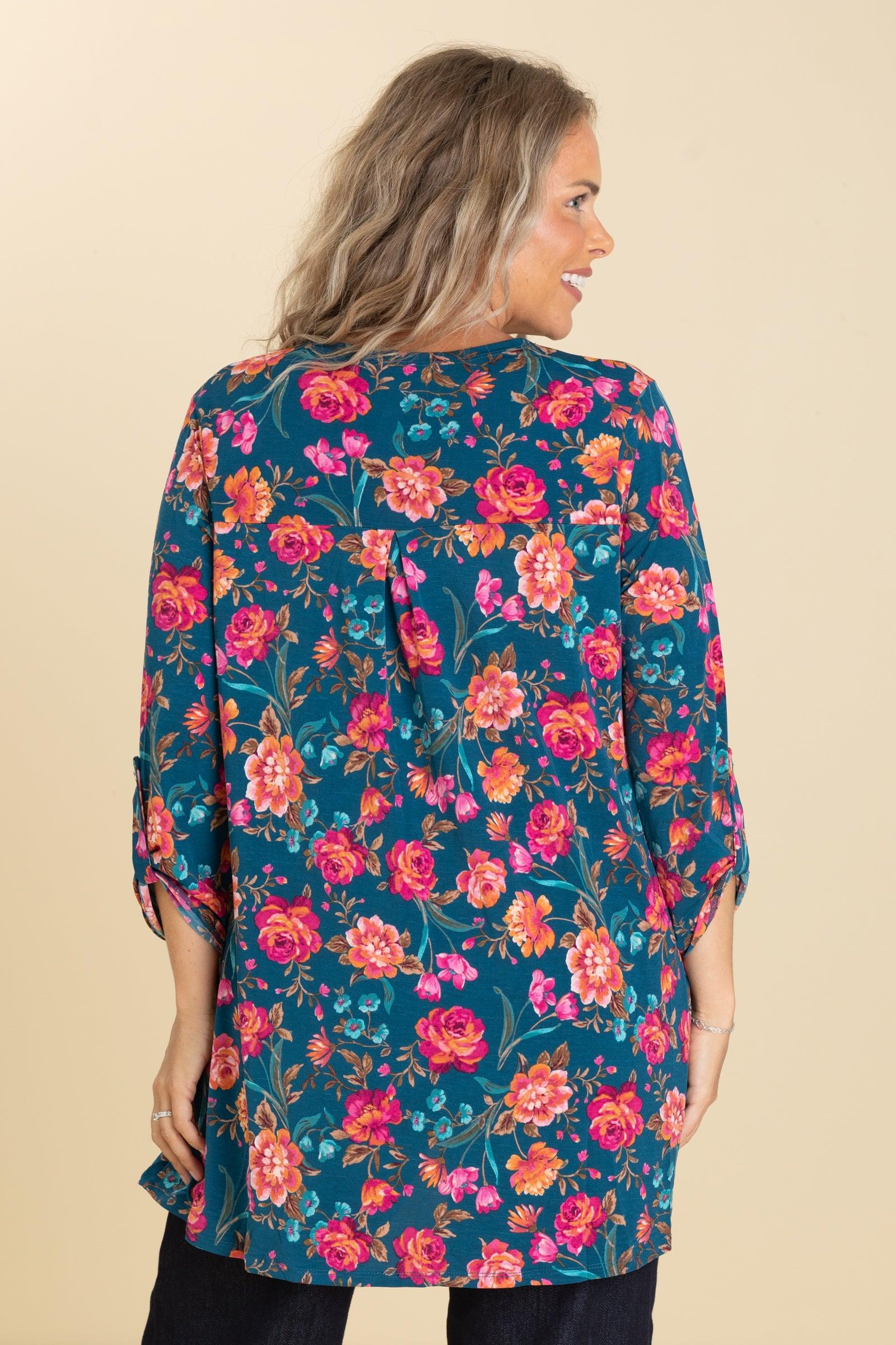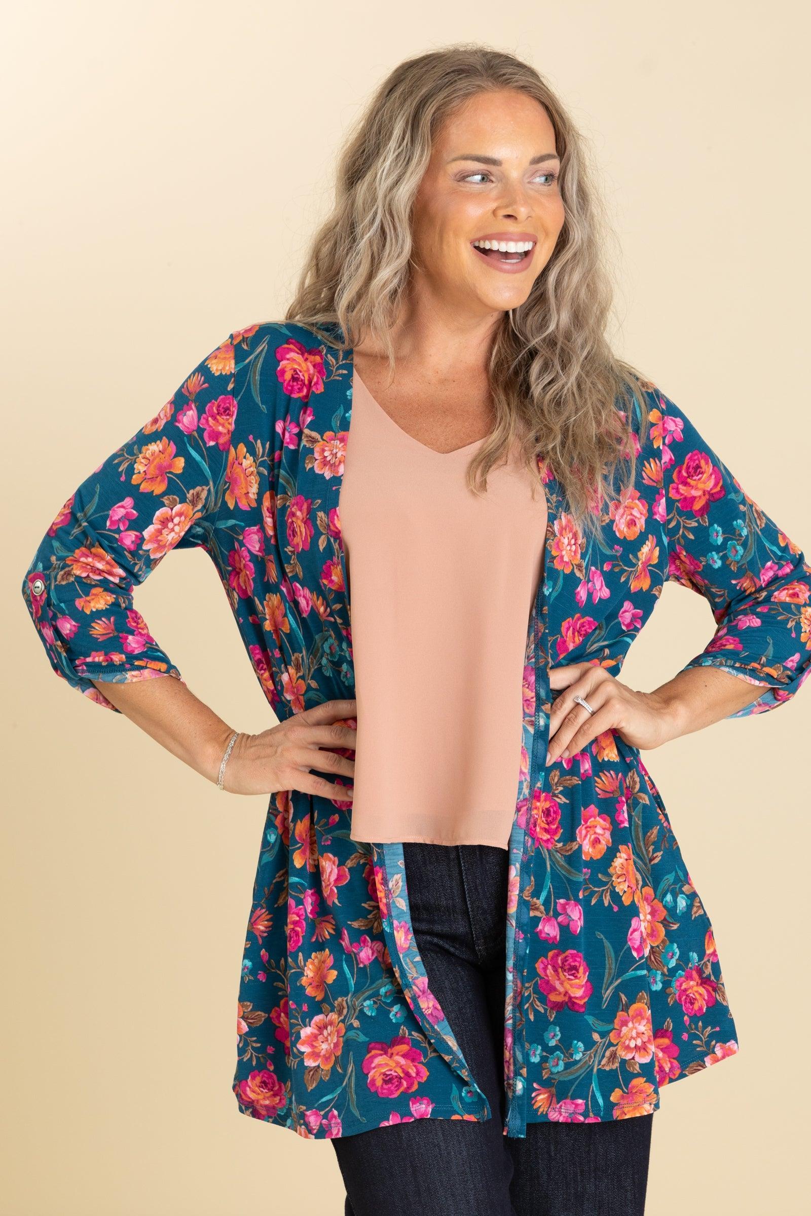 Product Details Colors: Teal, Orange and Pink Print: Floral Neckline: Open Front Sleeves: 3/4 Sleeves Hemline: Straight Brand: Dear Scarlett Material and Care 94% Polyester 6% Spandex Hand Wash Cold Line Dry Size and Fit Small: Bust 42" Waist 44" Length 31" Medium: Bust 44" Waist 46" Length 31.5" Large: Bust 47" Waist 49" Length 32" X Large: Bust 41" Waist 53" Length 33" 2X Large: Bust 54" Waist 56" Length 34" Erica is 5’7” and wearing her true size small