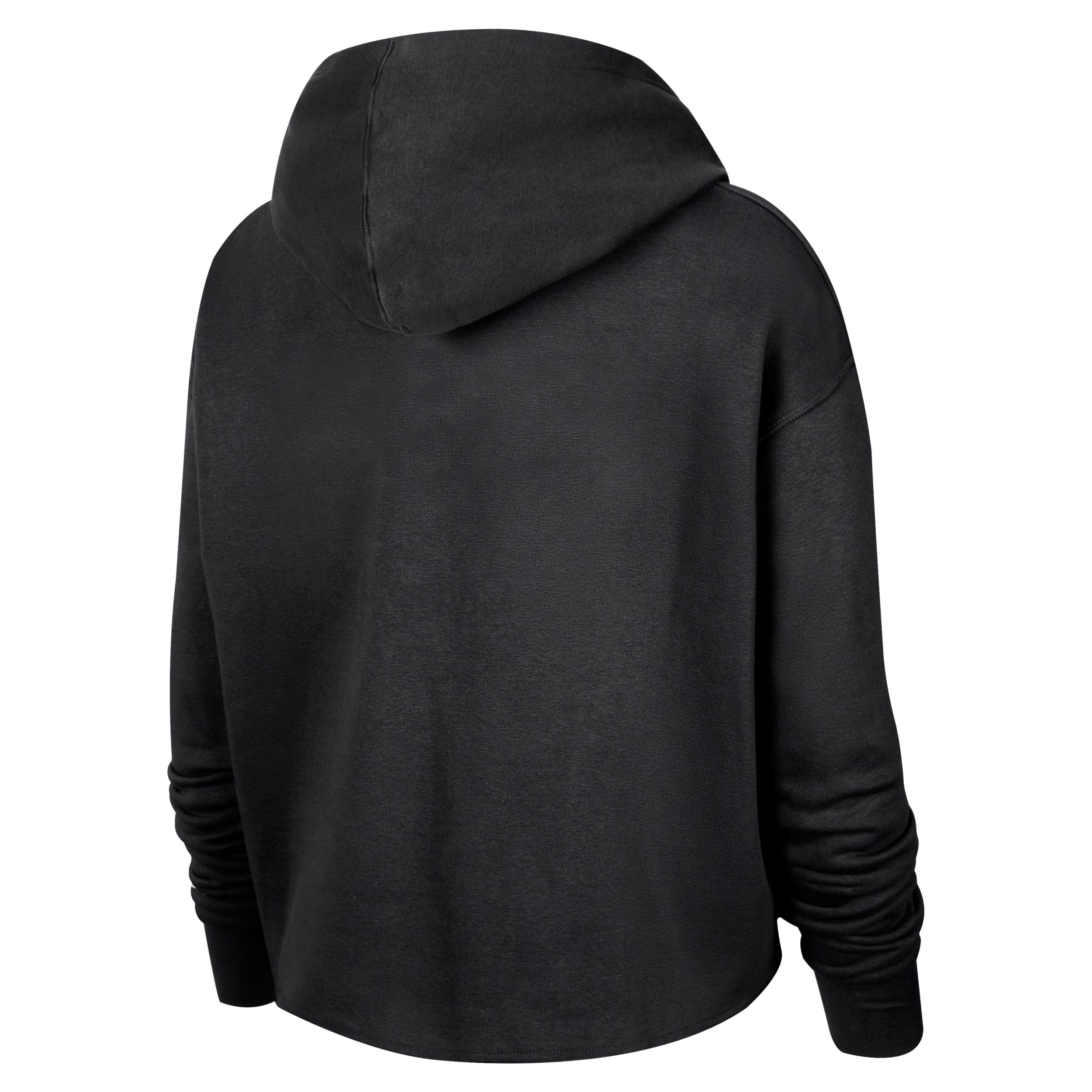 Don't let a little chill stand between you and your team. This incredibly soft, oversized Courtside hoodie shows your love for the Golden State Warriors with proud graphics on cozy fleece that brings the warmth in cooler temps. Product Details: Elastic at cuffs and hem. Front pocket. Body: 80% cotton/20% polyester. Hood Lining: 100% cotton. Oversized fit for a baggy, spacious feel. Machine wash. Imported. Style: DO0143; Color: Anthracite; Size: S; Gender: Female; Age Group: Adult | Golden State Warriors Courtside City Edition Women's Nike NBA Fleece Pullover Hoodie in Grey, Size: Small | DO0143-060