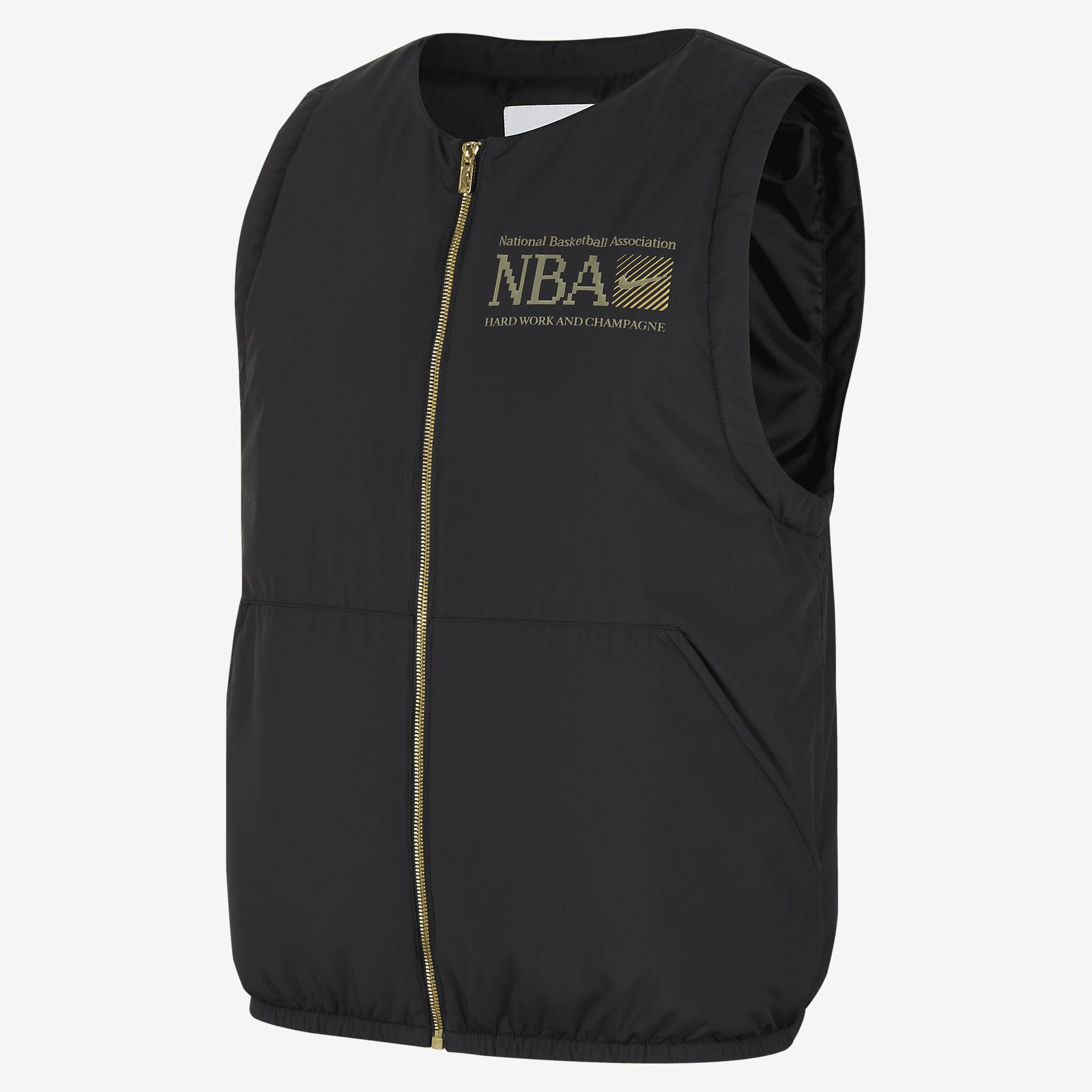 This roomy Team 31 vest has Therma-FIT technology to help keep you warm in chilly weather. The durable ripstop outer fabric is water-repellent to help shed rain, while the synthetic insulation adds warmth. Taffeta lining feels silky smooth and makes for easy layering, so you can pop it on over your favorite jersey or hoodie. Benefits: Nike Therma-FIT technology helps manage your bodys natural heat to help keep you warm in cold-weather conditions. Front patch pockets give you an easy place to store small items and warm your hands. Full-zip design with stand-up collar lets you change up your coverage. Product Details: Elastic hem. Body/Lining/Fill: 100% polyester. Machine wash. Imported. Style: FD8451; Color: Black/Summit White/Metallic Gold; Size: XL; Gender: Male; Age Group: Adult | Team 31 Club Mens Nike Therma-FIT NBA Woven Vest in Black, Size: XL | FD8451-010