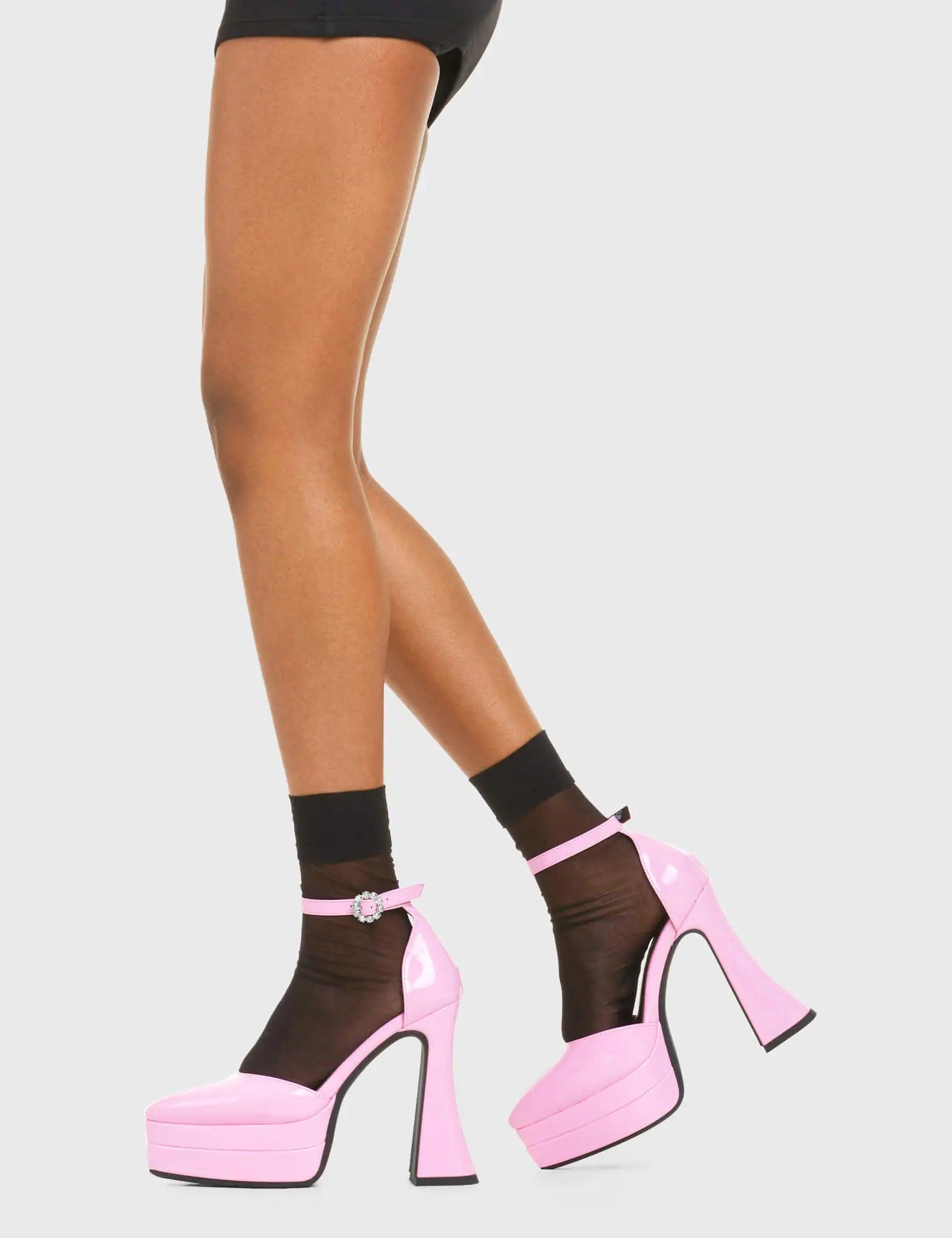 CATWALK READYTear of Joy Platform Heels in Pink patent. These platform boots feature a minimalist look with a flared heel, keeping it nice and classy. Made with eco-friendly materials and 100% cruelty-free, these platform boots are as ethical as they are chic.- Platform Height- Adjustable strap- Flared heel- Pointed toe- High Heel- 100% vegan SKU: LMF 3525 - PinkPAT