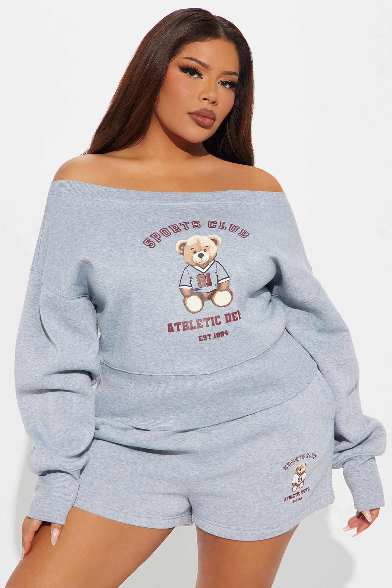 Available In Heather Grey. Off Shoulder Long Sleeve Front Screen Stretch Pair To "Teddy Sports Club Mini Shorts" Disclaimer: Due To The Printing Process A Difference In Saturation May Occur. Each Garment Is Unique. 100% Polyester Imported