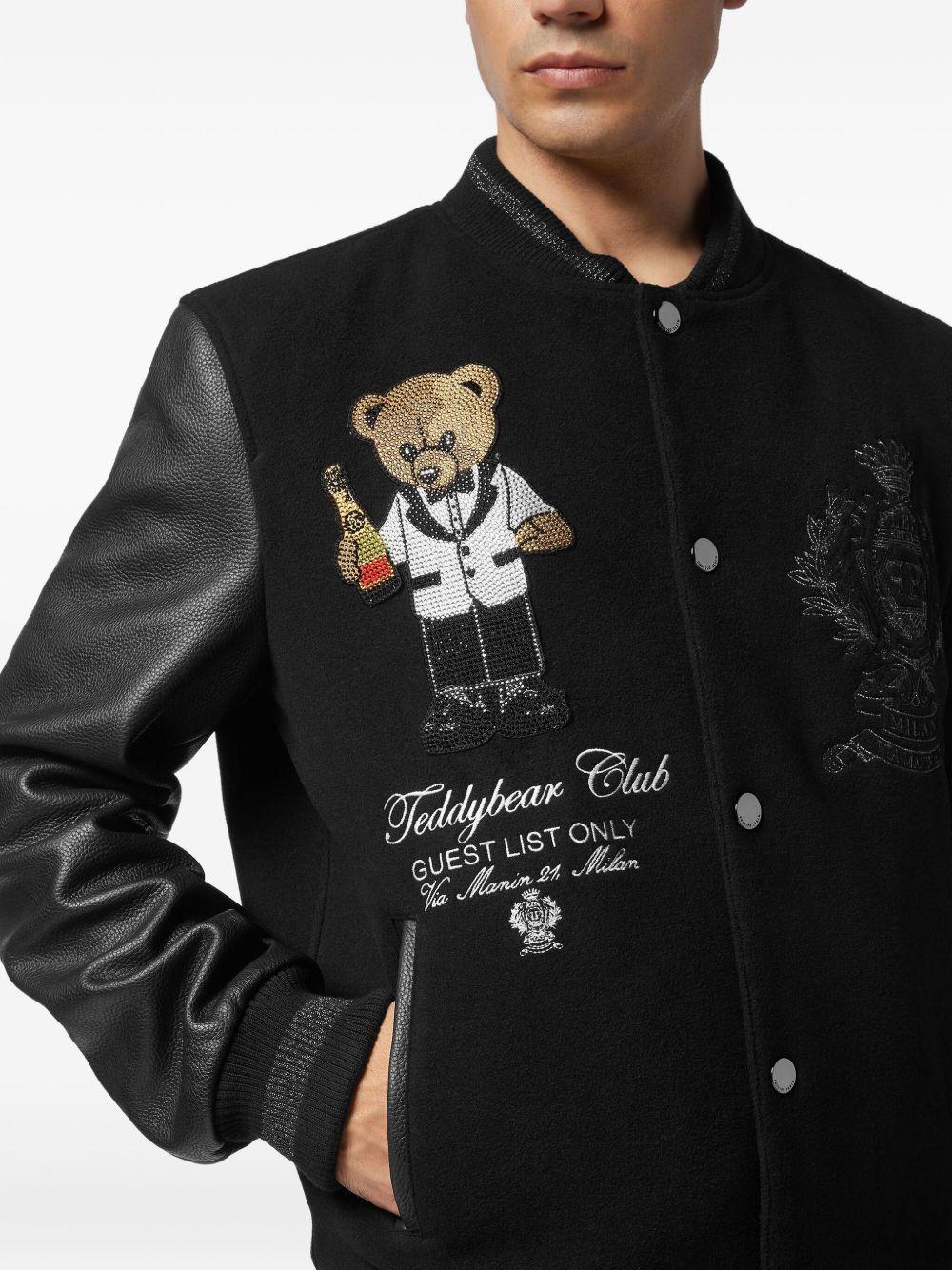 Philipp Plein Teddy Stones embellished teddy bear jacket | Black | black | embroidered teddy bear motif | snap button fastening | leather sleeves | crest detailing | ribbed trims | Calf Leather/Polyester/Viscose/Elastane/Polyester | Bomber Jackets | Jackets | Clothing | Men