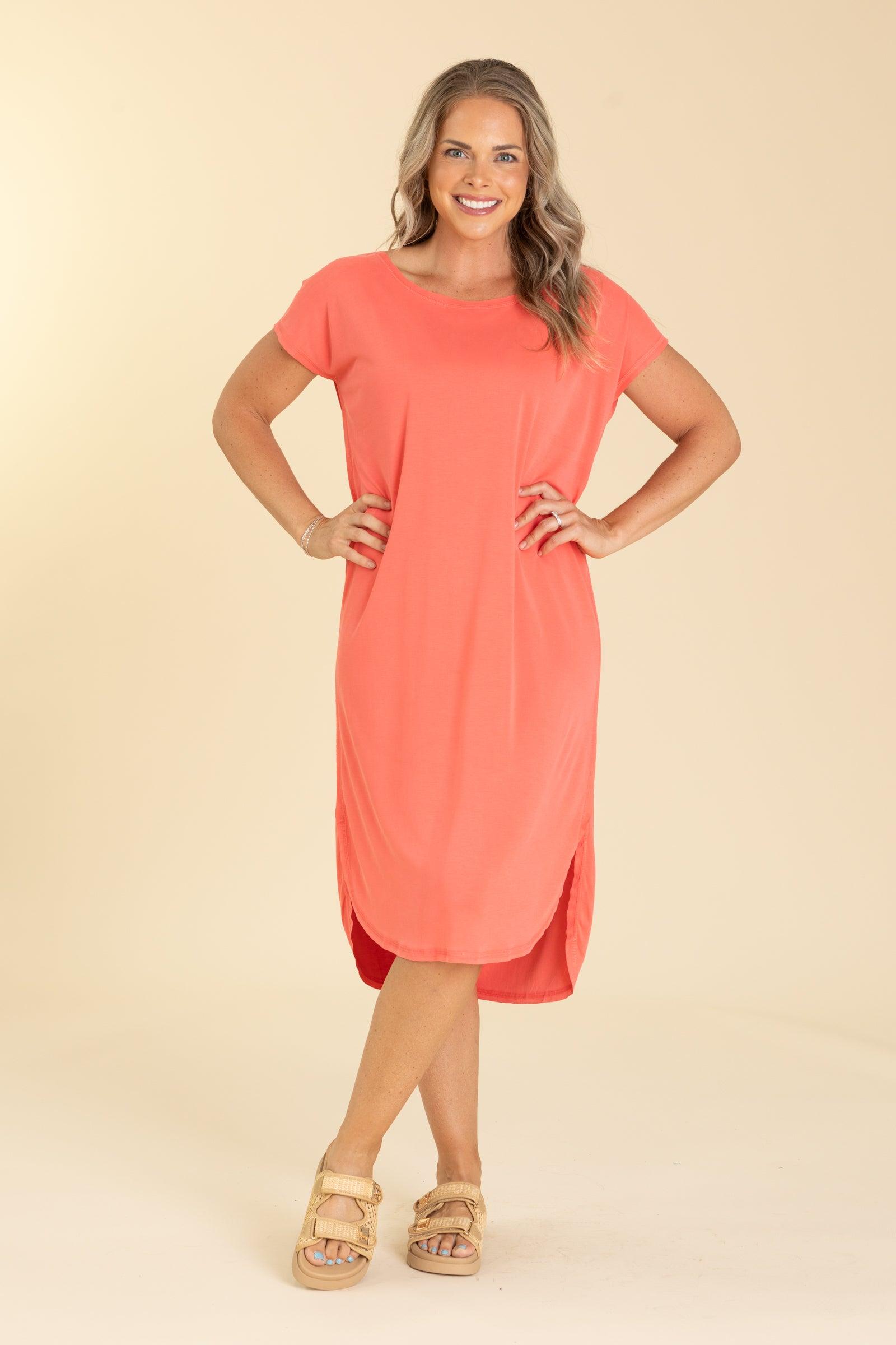 Product Details Colors: Coral/ Dusty Indigo/ Teal Print: Solid Neckline: Round Sleeve: Short Sleeve Hemline: Round Hi/Lo Brand: Double Zero Material and Care 82% Modal 18% Polyester Hand Wash Cold Hang/Line Dry Size and Fit Small: Bust 44" Waist 42" Length 41"/44.5" Medium: Bust 46" Waist 44" Length 41.5"/45" Large: Bust 48" Waist 46" Length 42"/45.5" Erica is 5’7” and wearing her true size small Courtney is 5’8” and wearing her true size large