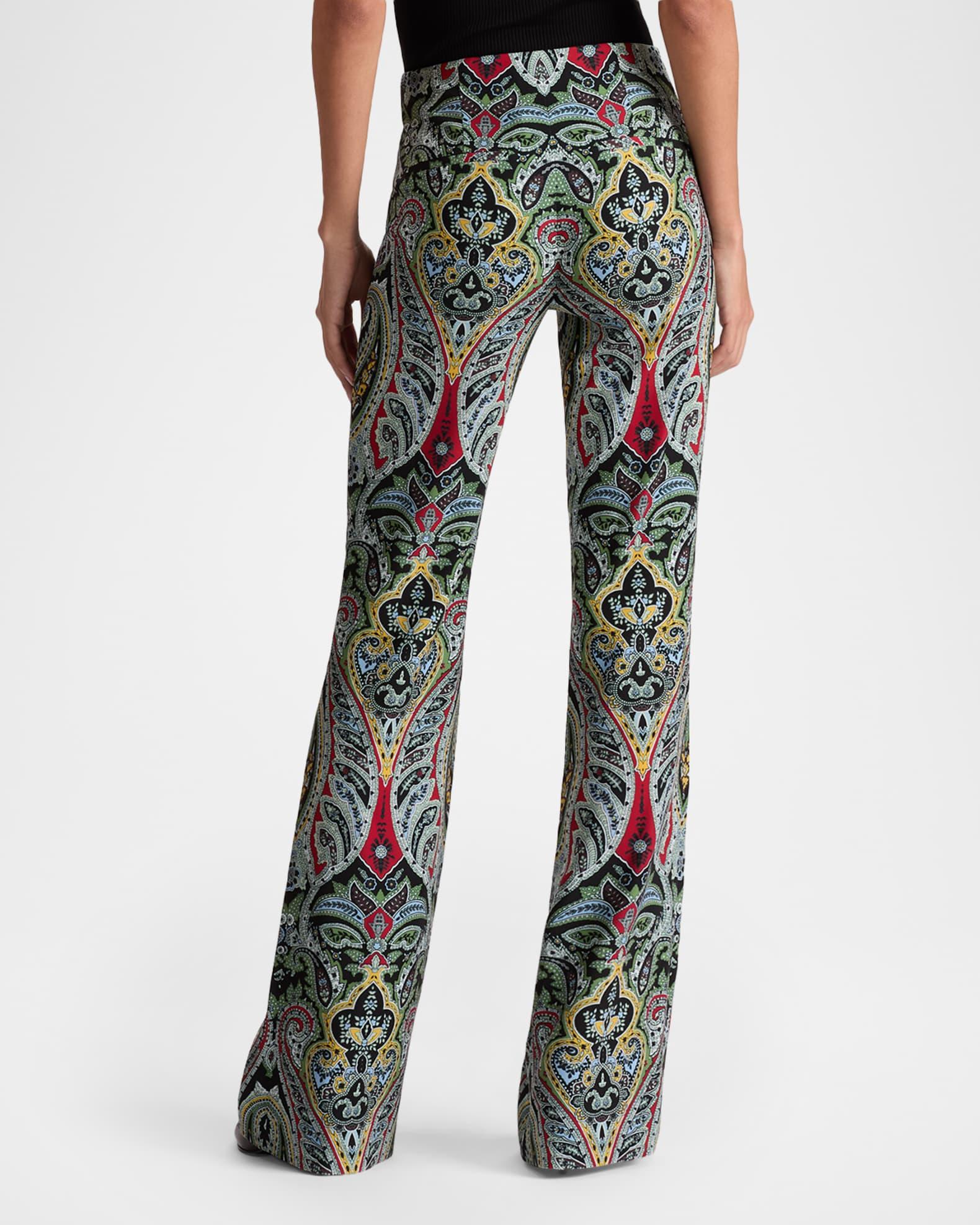 Patterned with bold paisleys on silky satin back crepe, the Teeny pants by Alice + Olivia are fitted through the hip and thigh for an ultra-flattering silhouette Approx. 35.3" inseam Mid-rise sits high on hip Back welt pockets Full length Bootcut legs Hidden front hook and zipper closure Polyester Lining: Recycled polyester Dry clean Imported