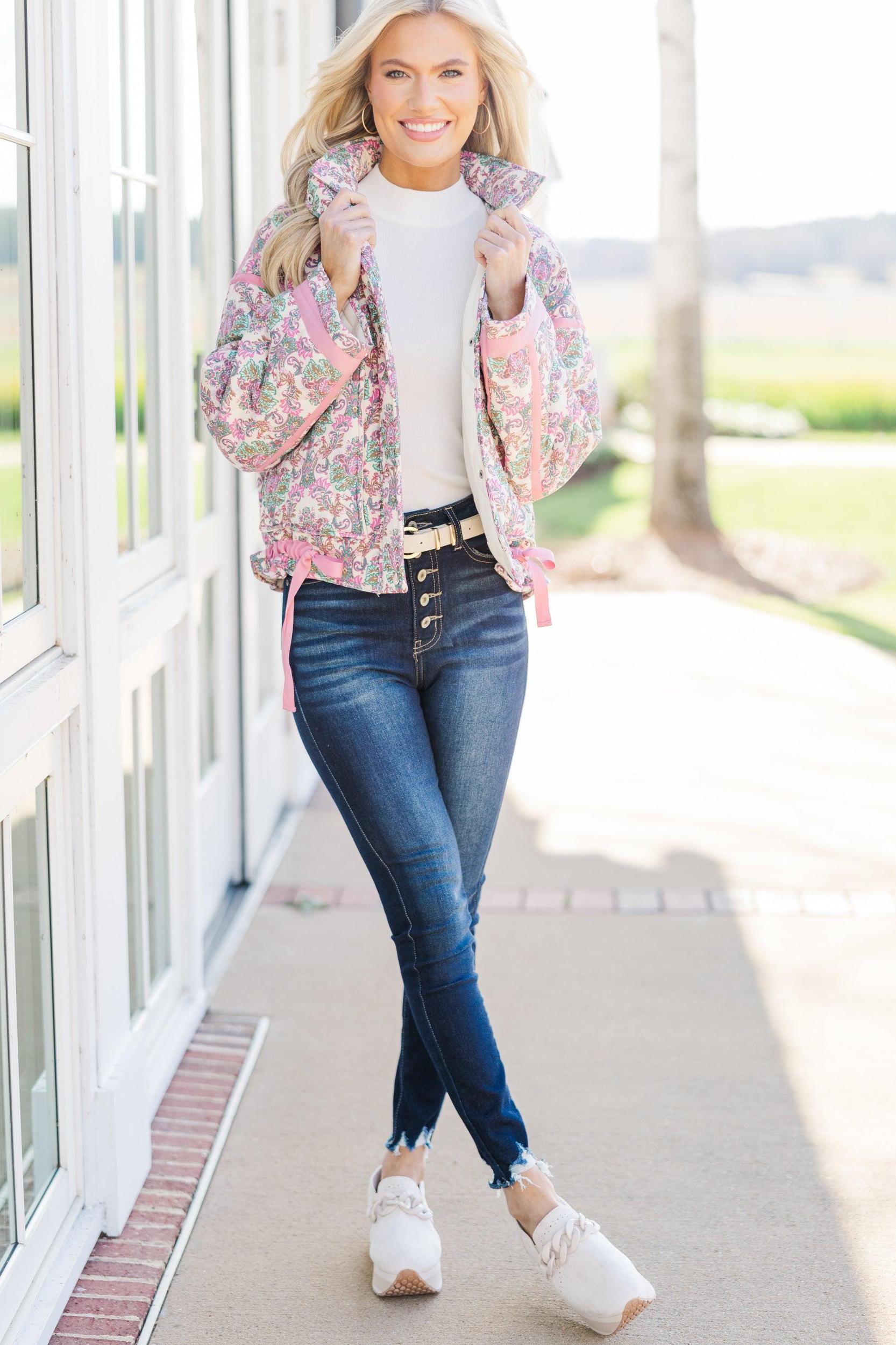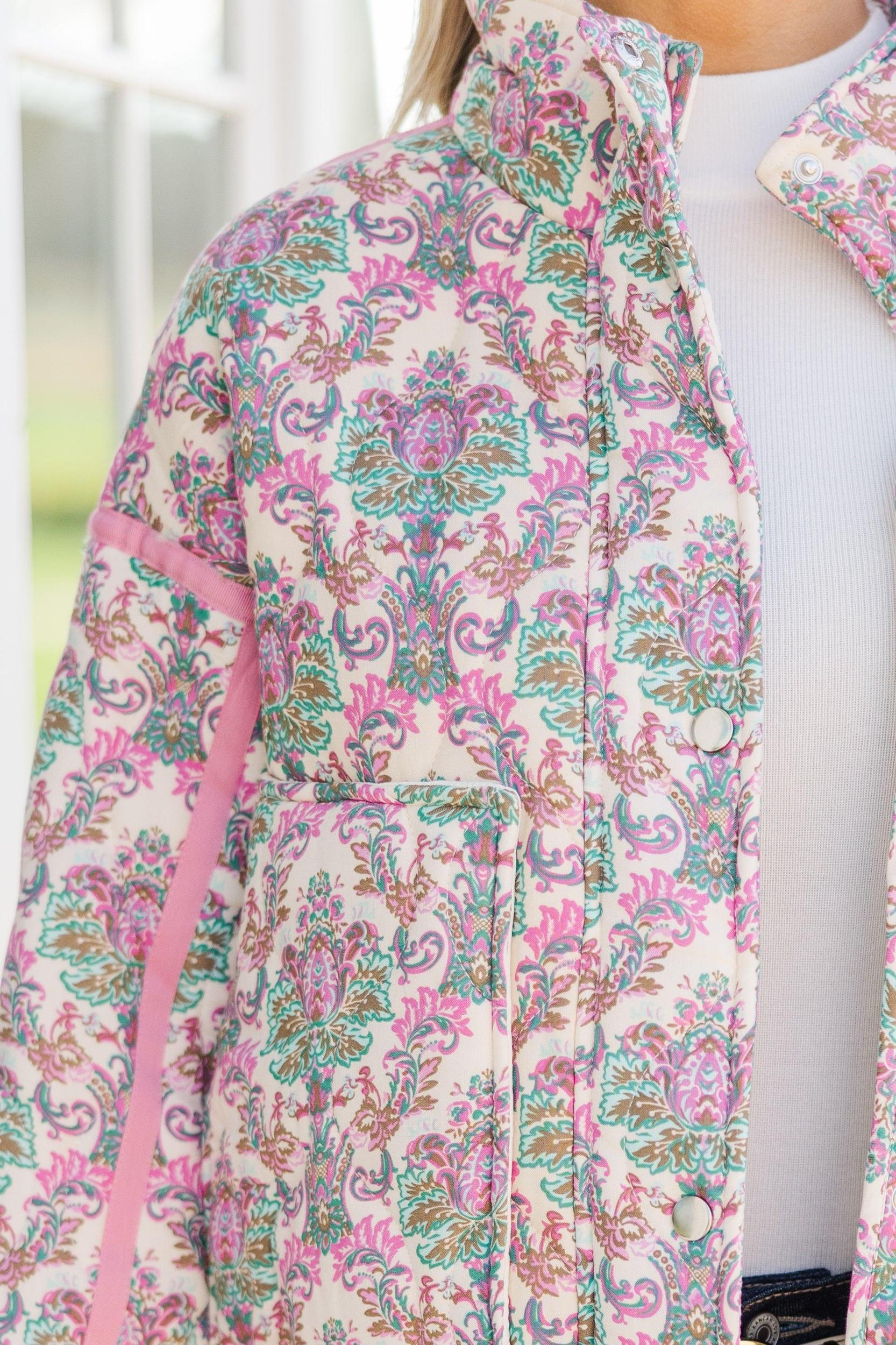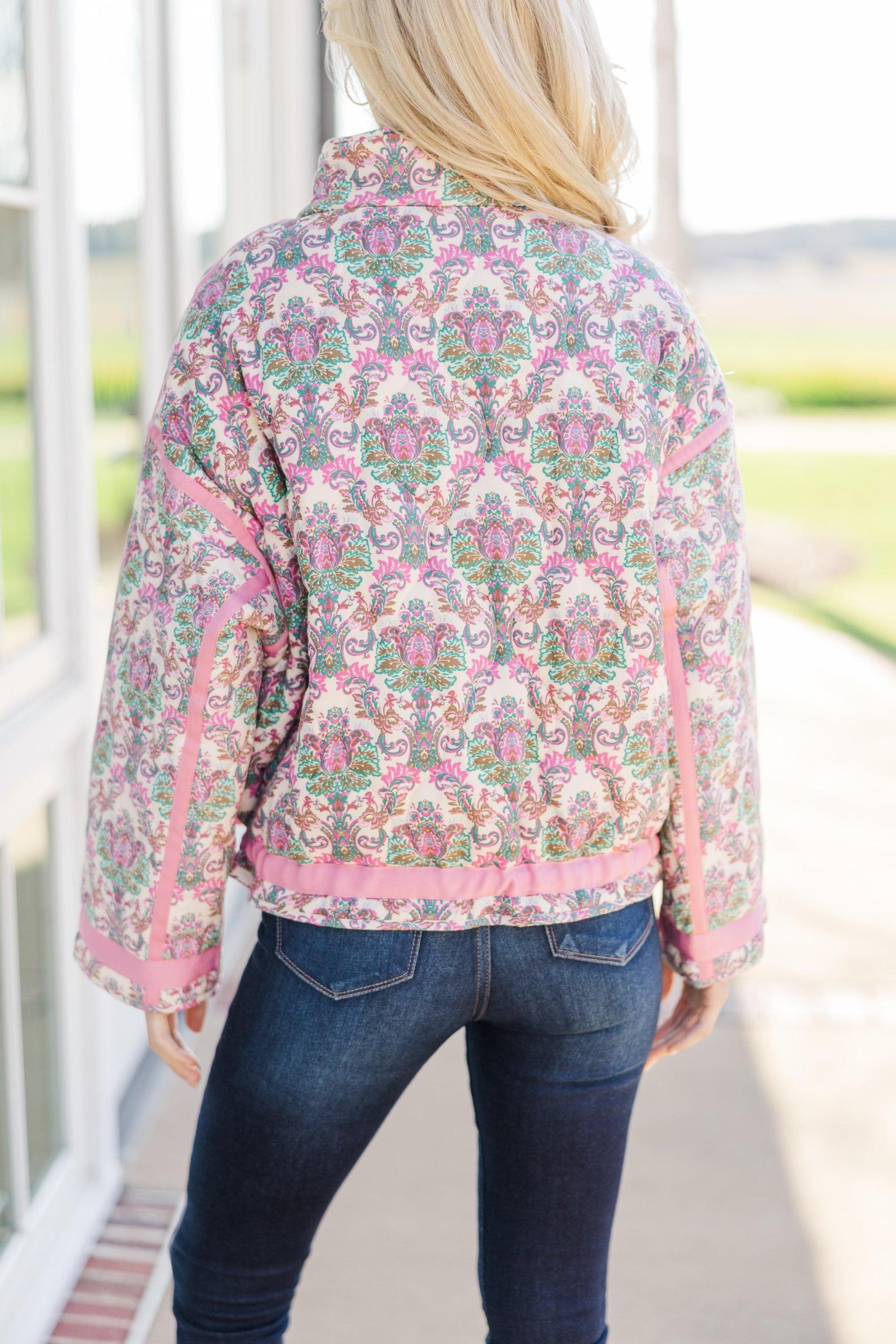 We couldn't possibly think of a more feminine or cute jacket for the upcoming spring season! Those hues are so pretty together and we love that intricate print. This quilted jacket is going to be a must this spring! High round neckline Button down front closure Long sleeves Damask pattern Bow detailing No stretch Baileigh is wearing the small.