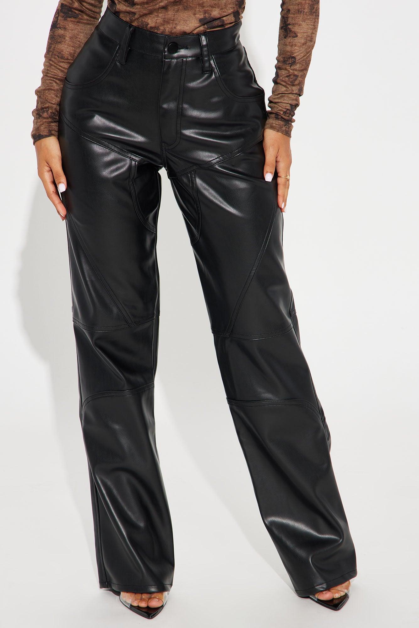 Available In Black. Faux Leather Pant Mid Rise Button & Zip Closure Seaming Detail Straight Leg Low Stretch 32" Inseam 50% Polyurethane 50% Polyester Imported California Proposition 65 WARNING: Cancer and Reproductive Harm - www.P65Warnings.ca.gov.