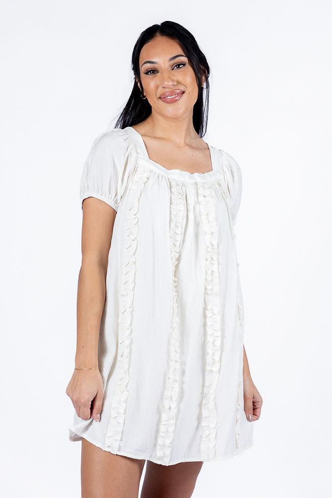 Details Ivory Ruffle Front A-Line Romper Dress Fabric has no stretch Elastic square neckline, lace up back bow, ruffle detailing Unlined Size small from shoulder to hem: 30" Material and Care 80% rayon 20% polyamide Hand wash cold, no drum drying Patterns may vary Materials may have natural variations Colors may vary from different viewing devices.