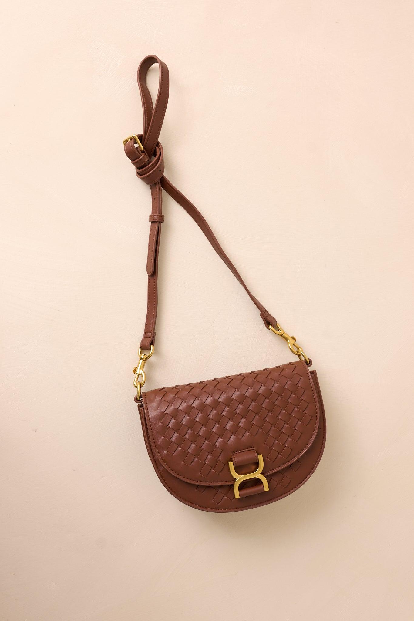 Elevate your style with Tempest's Call Chocolate Brown Woven Faux Leather Handbag. This sleek and stylish handbag features a woven design and faux leather material for a sophisticated look. The spacious interior and multiple pockets provide ample storage for all your essentials, making it the perfect accessory for any occasion. This brown handbag features a brown woven faux leather material, gold hardware, a gold buckle snap closure, a fold over design, a built in inside pouch, a solid brown shoulder strap mimicking a belt and an optional clutch design.