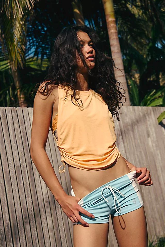 **Features:** Sweat-wicking fabrication; four-way stretch; breathable; ruched side detail; boat-neck; muscle tee sleeves with oversized opening