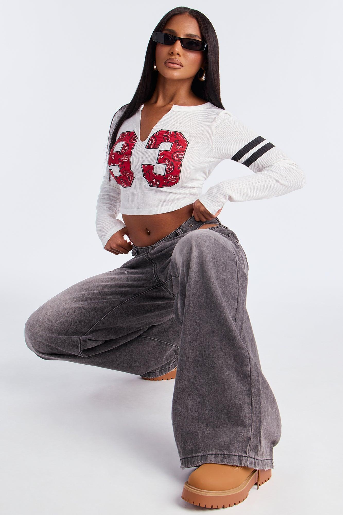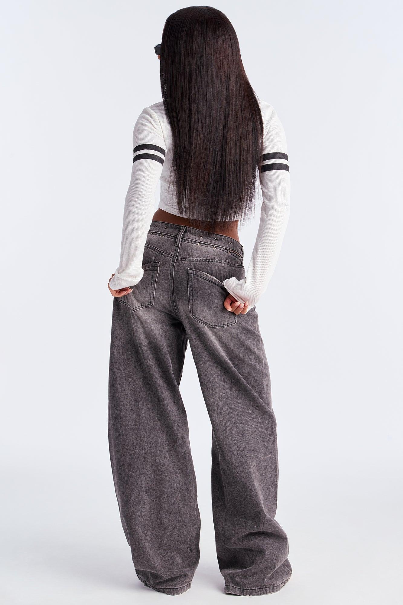 Available In Black Wash. Wide Leg Jean 5 Pocket Cut Outs Grommet Detail 10.5" Rise 33" Inseam Non Stretch Disclaimer: Due To The Specialized Wash Process, Each Garment Is Unique. 98% Cotton 2% Polyester Imported California Proposition 65WARNING: Cancer and Reproductive Harm - www.P65Warnings.ca.gov.