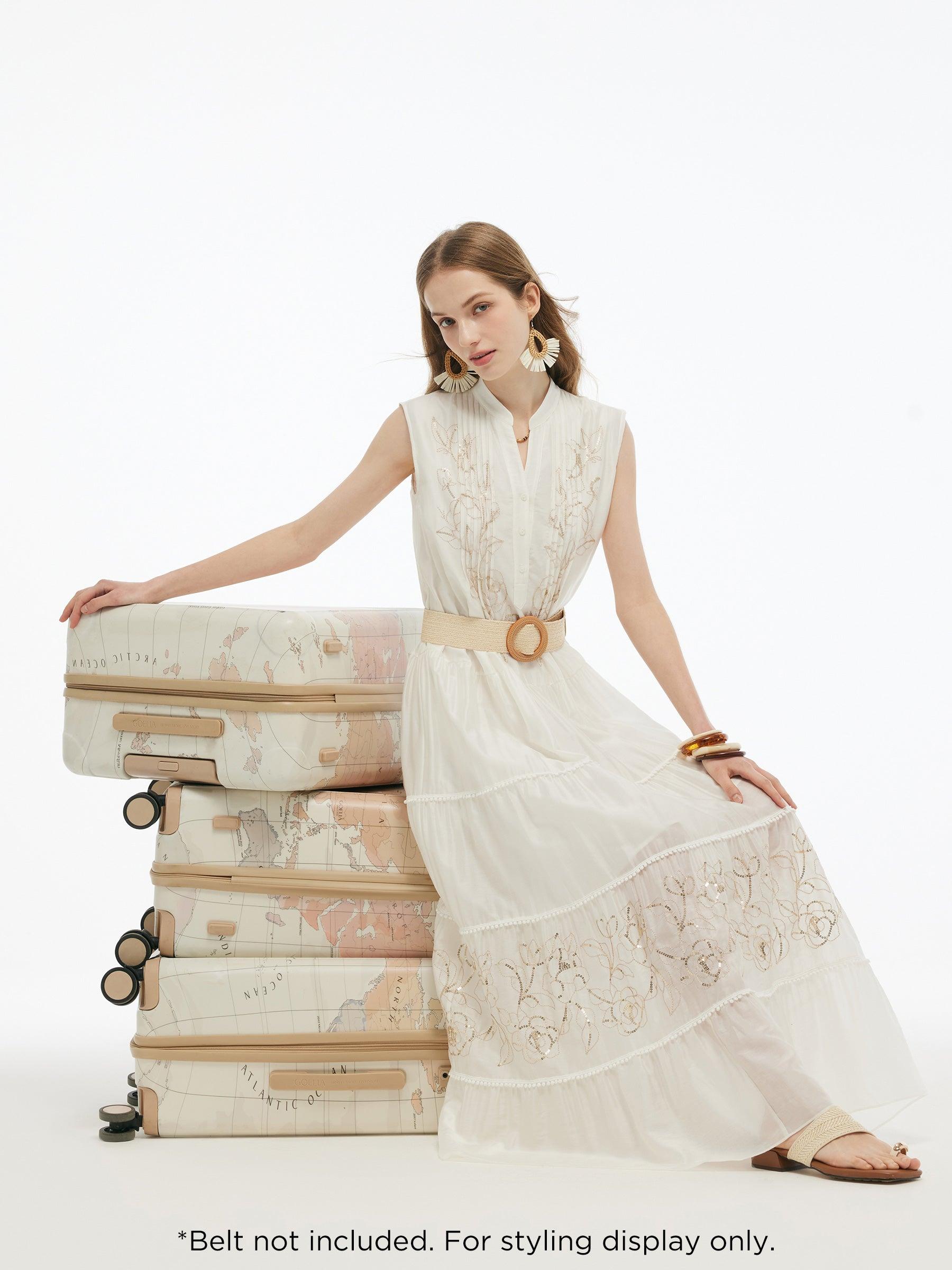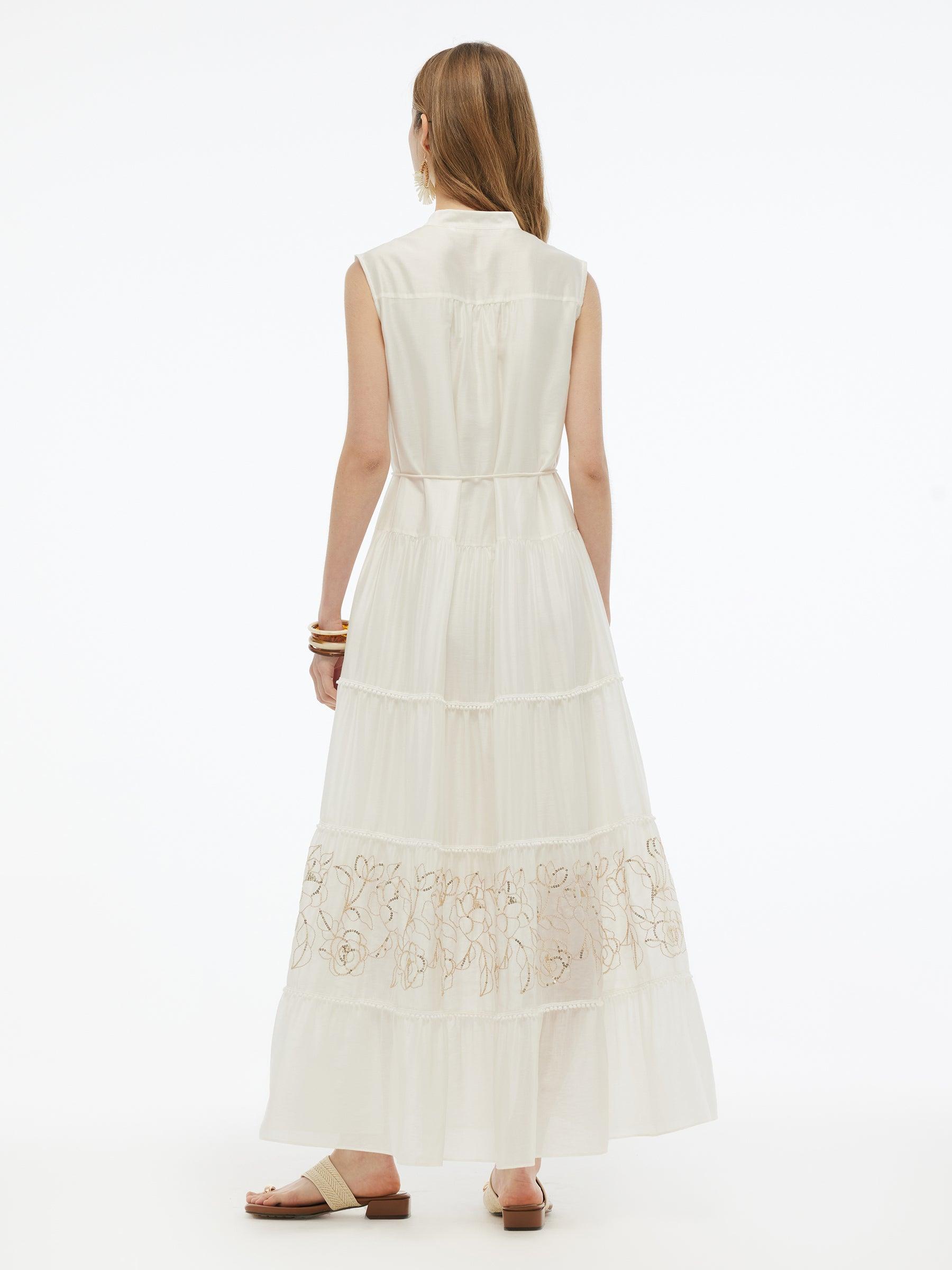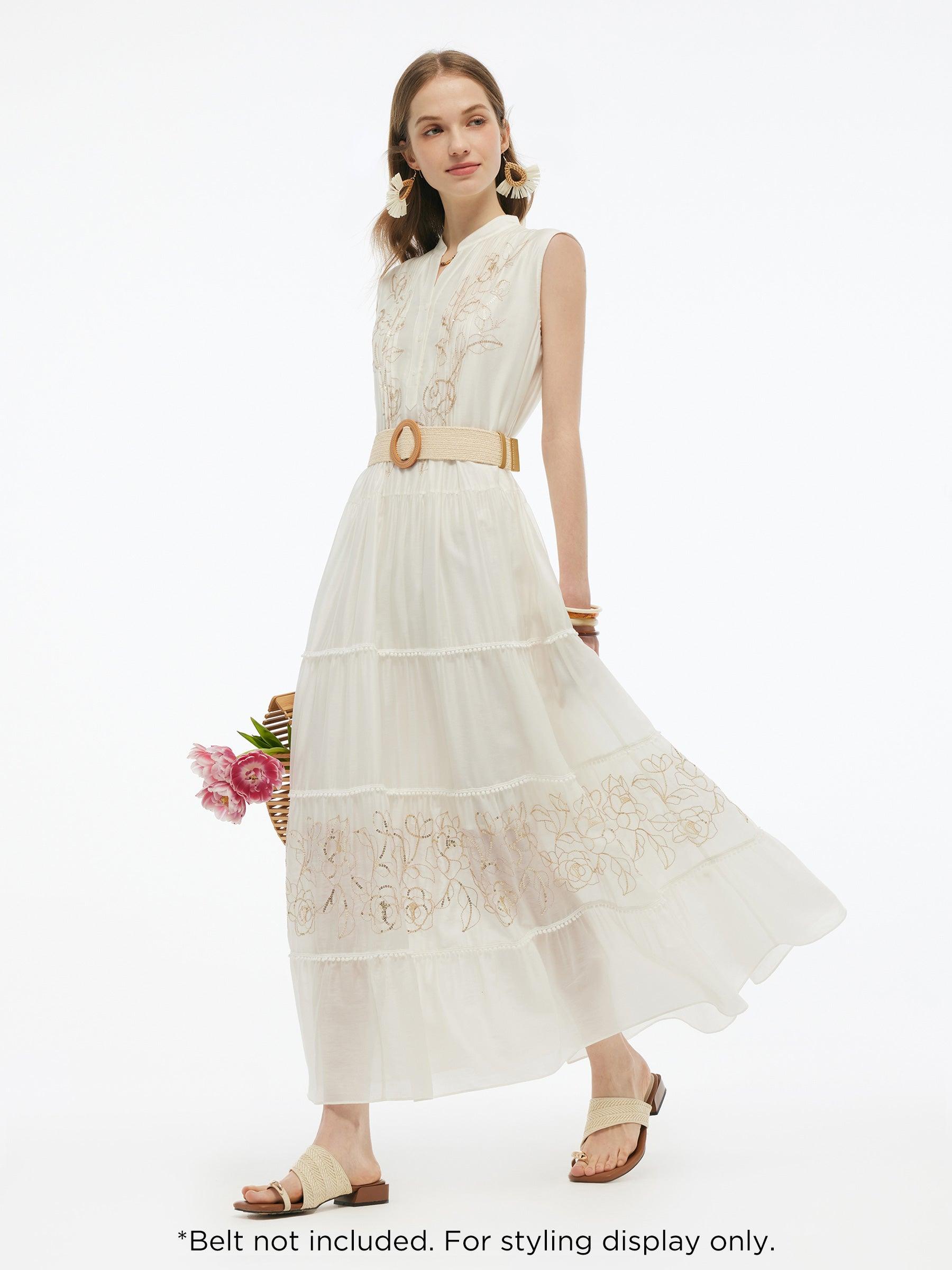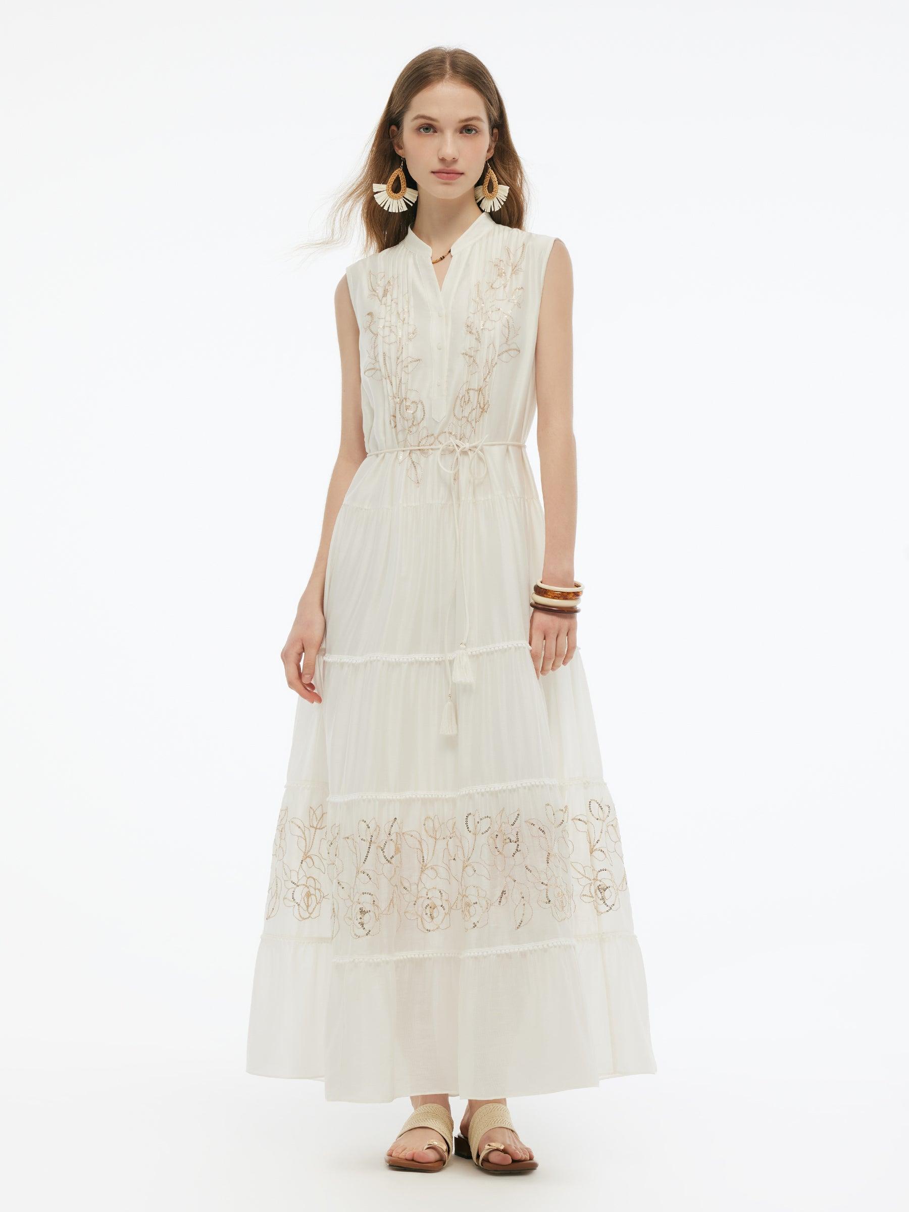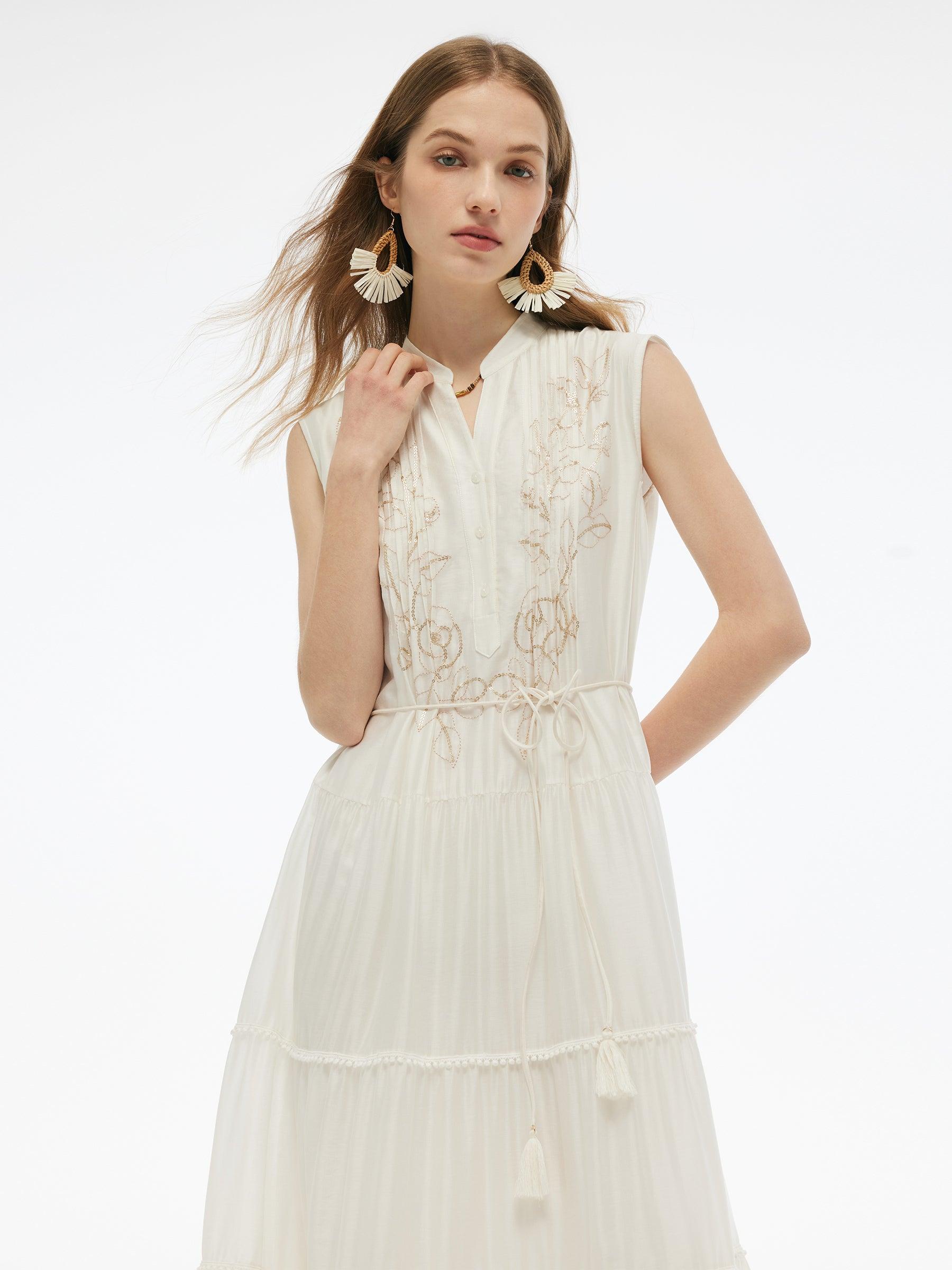 -Tencel-blend fabric -Loose fit -With tie string belt Crafted with tencel-blend fabric, this dress has a soft tiered silhouette and voluminous hem. Designed with a relaxed A-line silhouette, it features an adjustable waist tie for a customizable fit. The intricate embroidery and shimmering beadwork add a touch of sophi