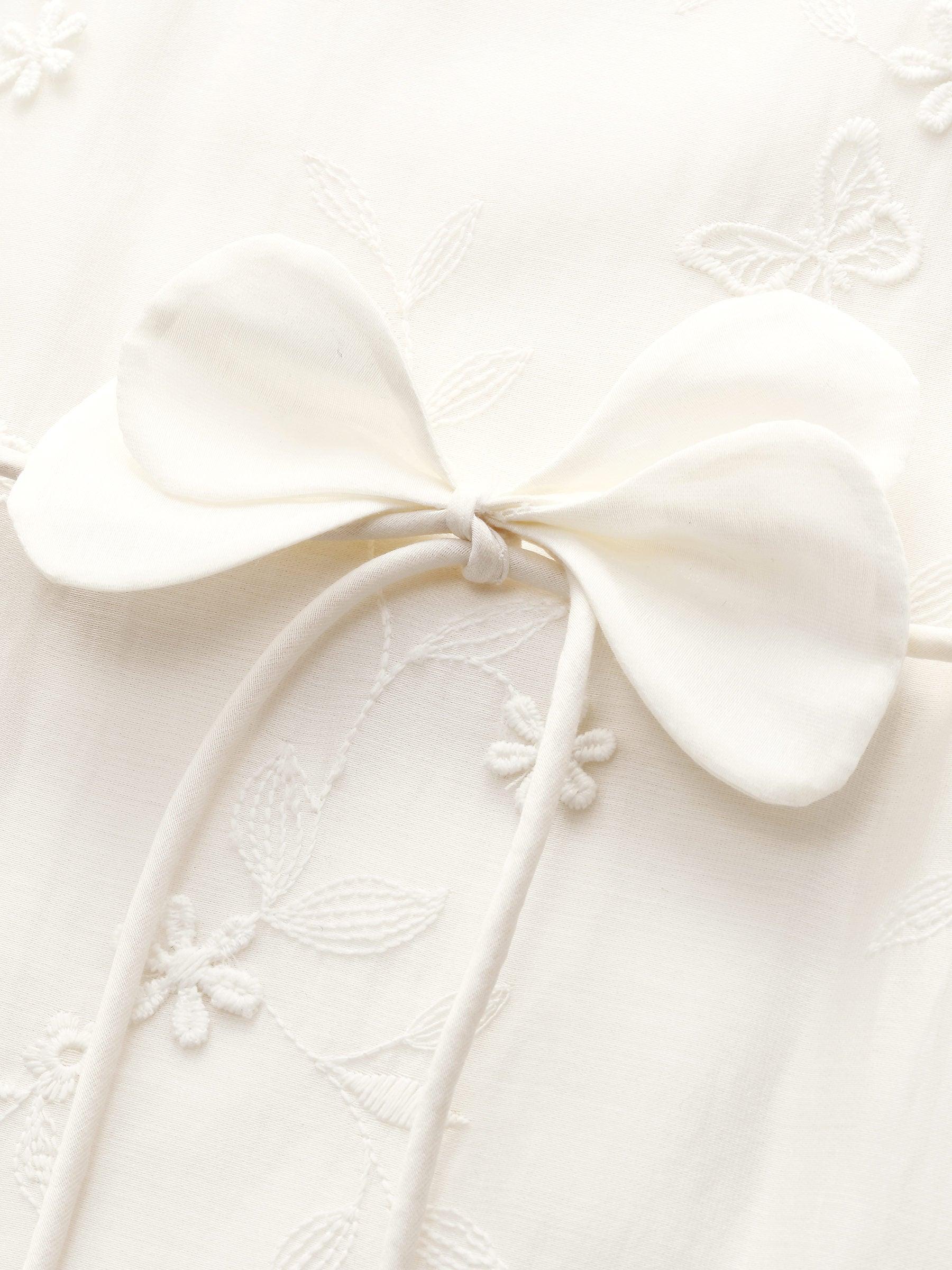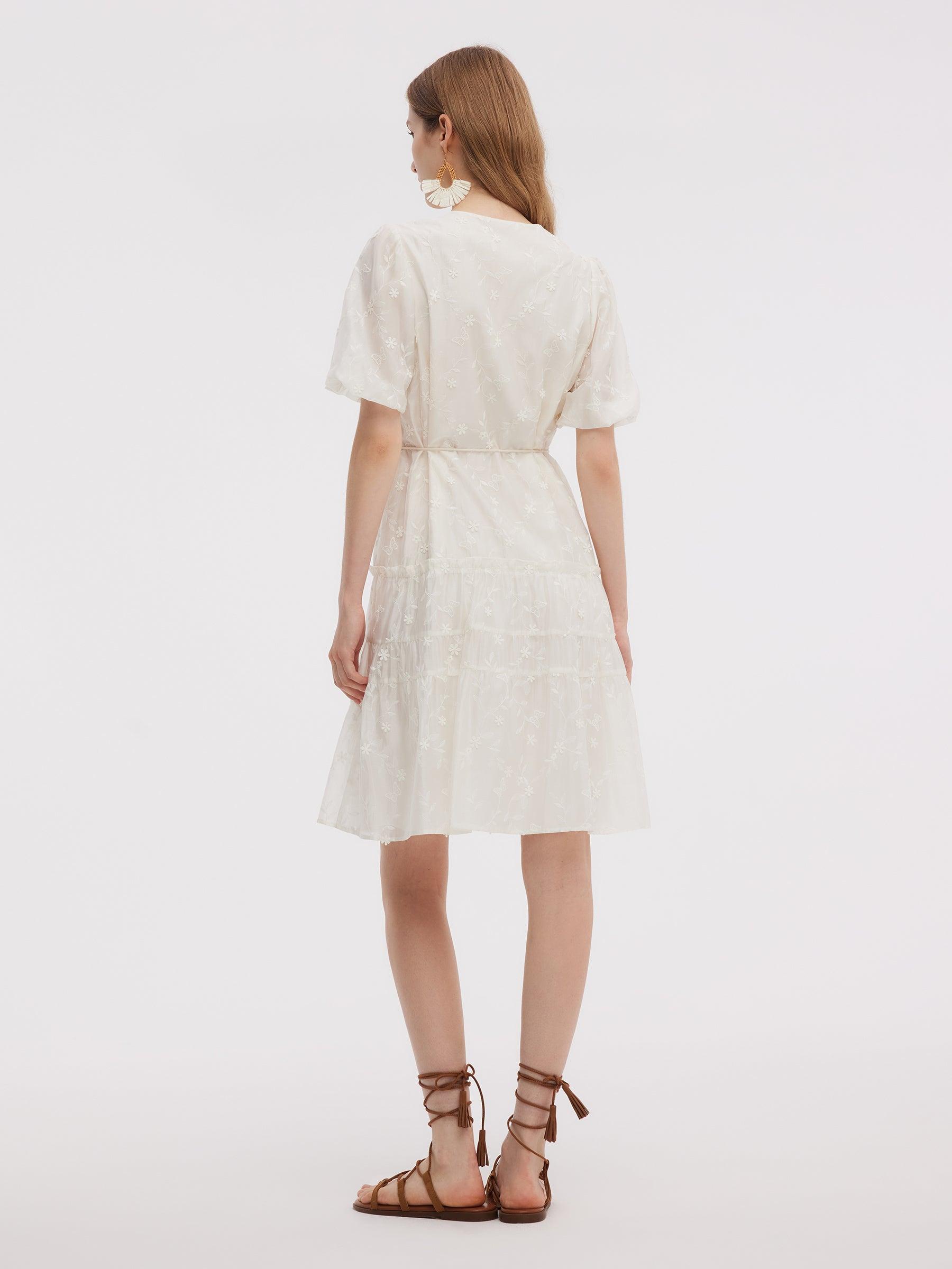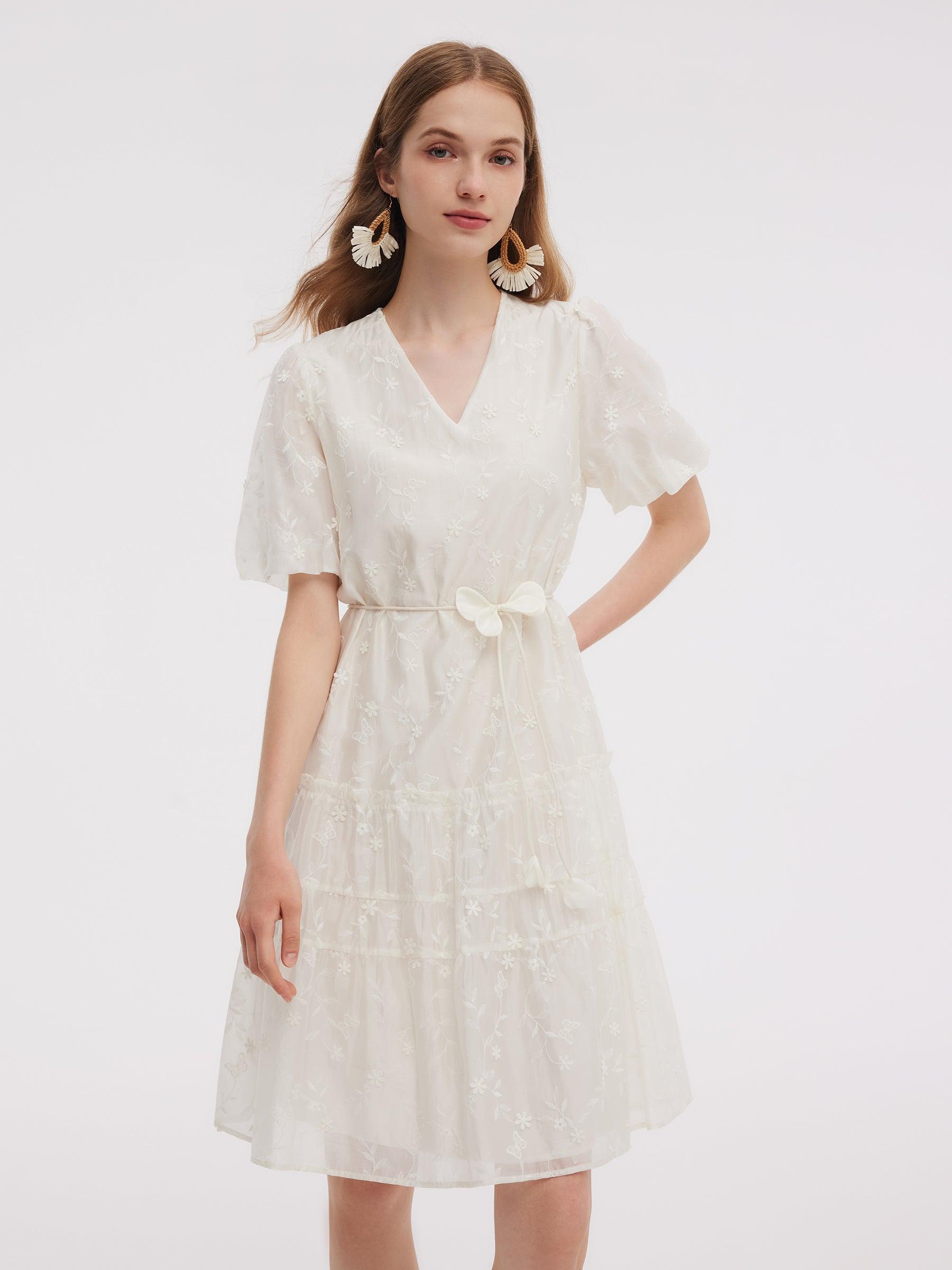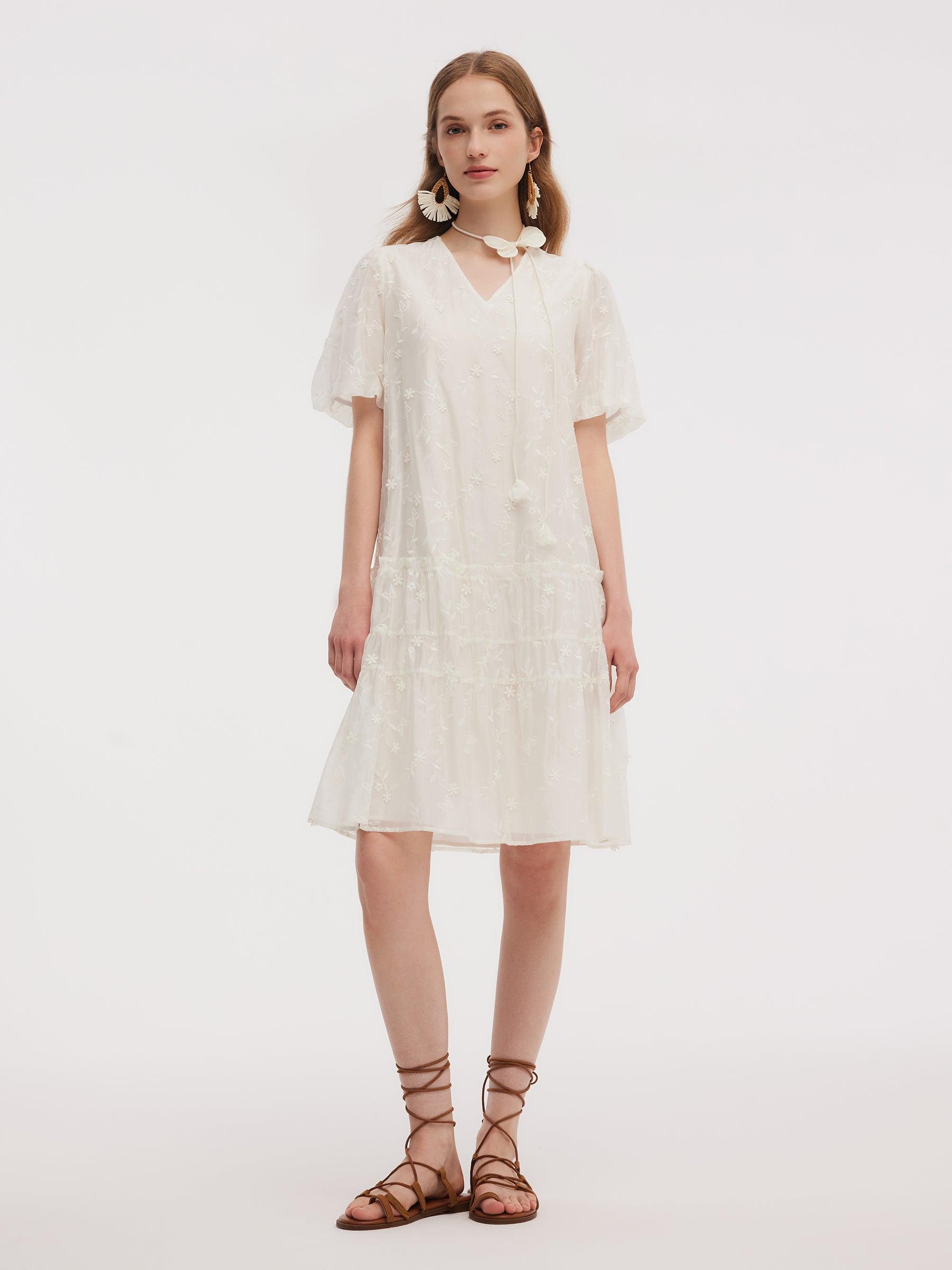 -Tencel blend fabric -With tie belt -Puff-sleeved design This mini dress offers ease for all day wear with its soft and breathable tencel blend fabric, draping beautifully. A matching tie belt is included, which can be worn at the waist or neck to create different looks and add a dynamic, romantic touch. Refined embroi