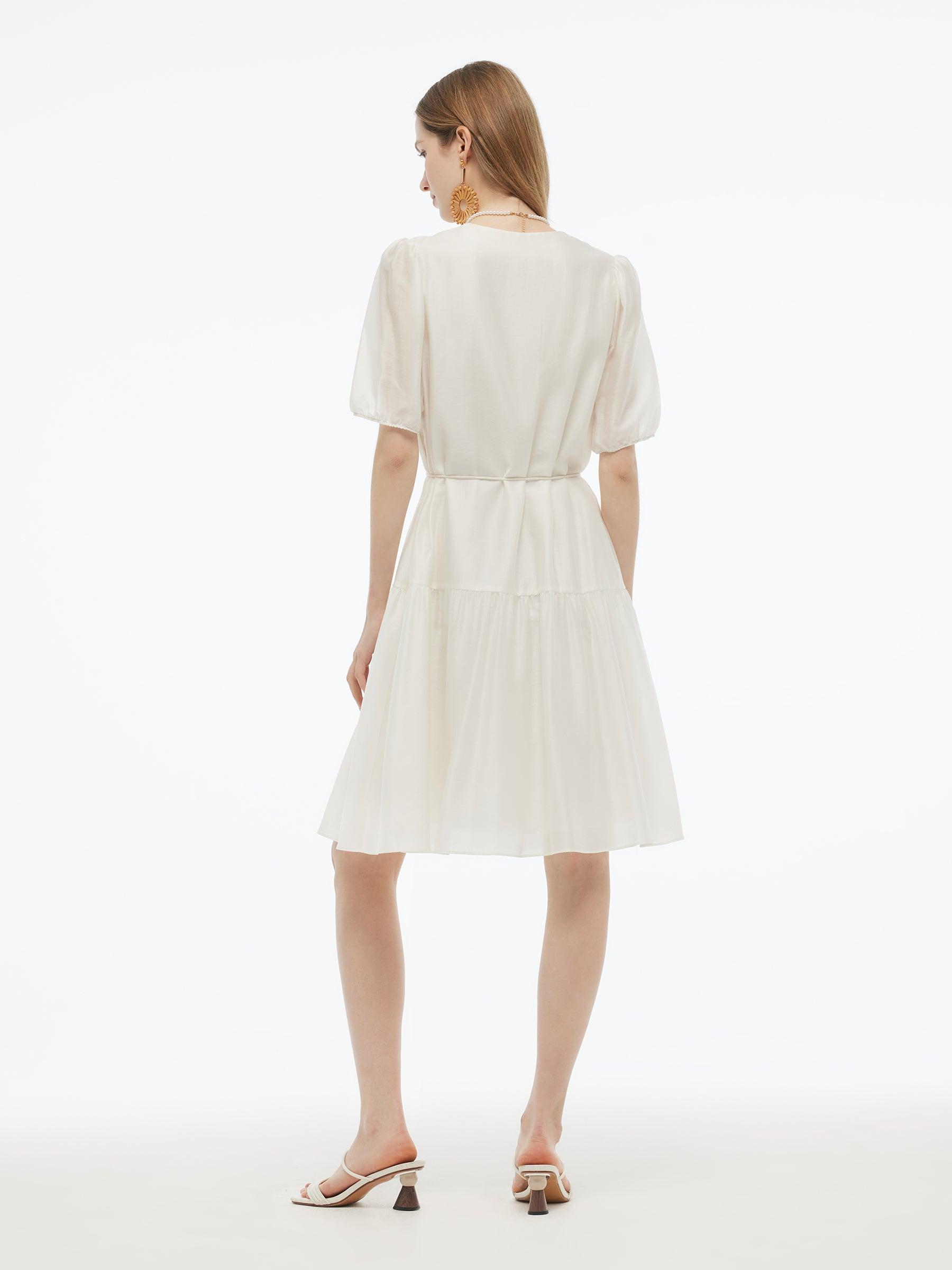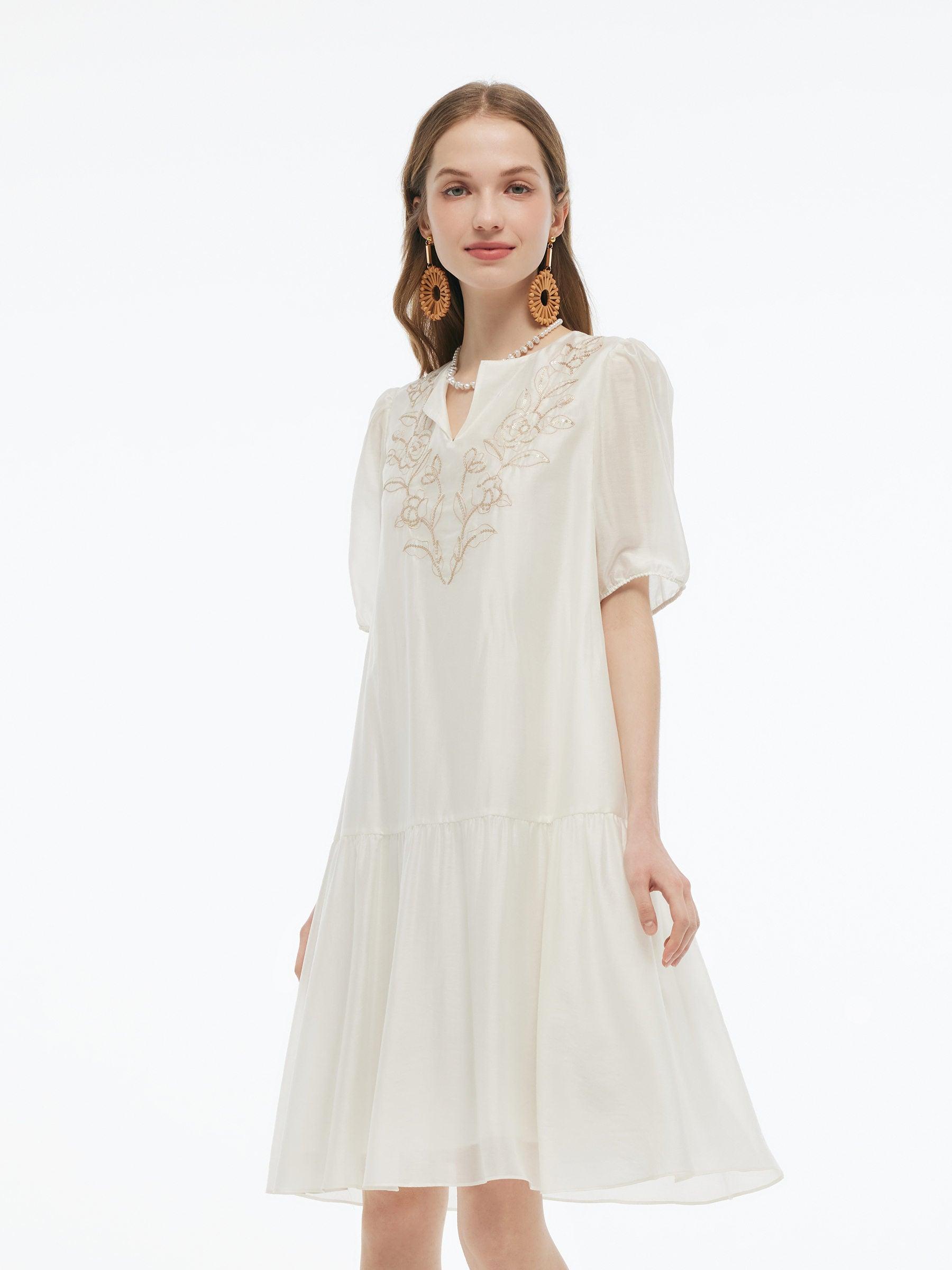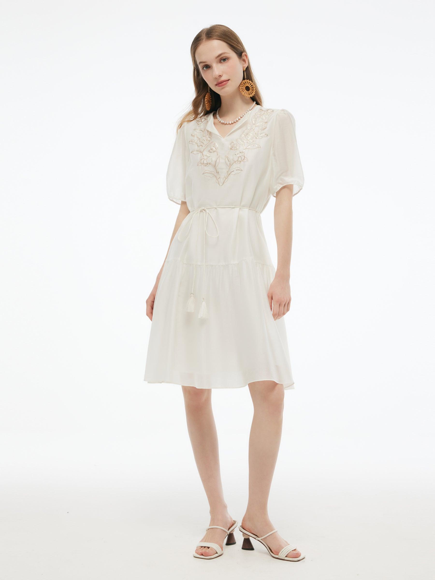 -Eco-friendly tencel-blend fabric -With tie string belt -With sequins Graceful yet captivating, this dress features soft tencel-blend fabric and a loose A-line silhouette combined with a cinched waist tie string belt , offering both comfort and style. The exquisite 3D embroidery with sequins adds a touch of sophisticat