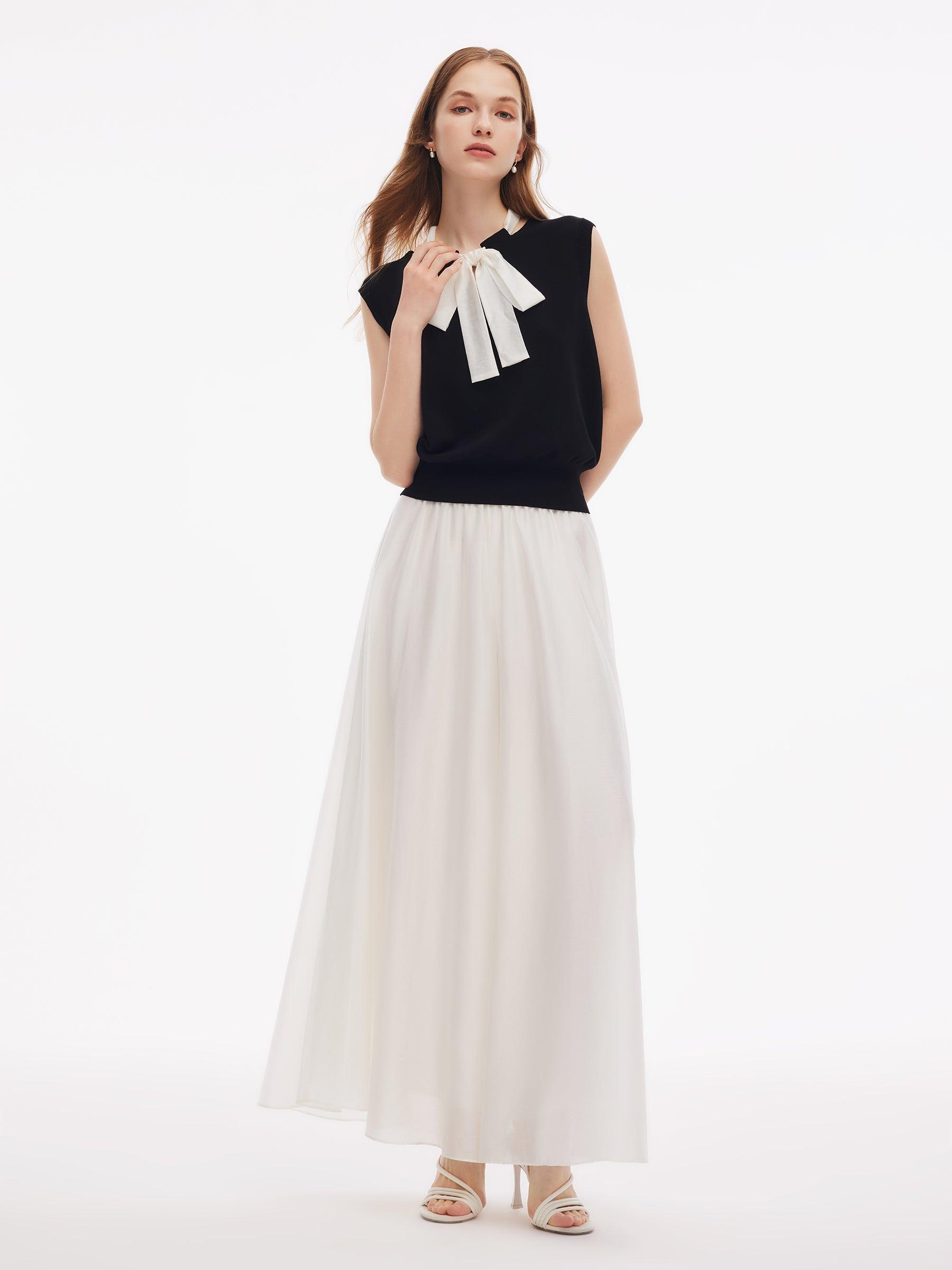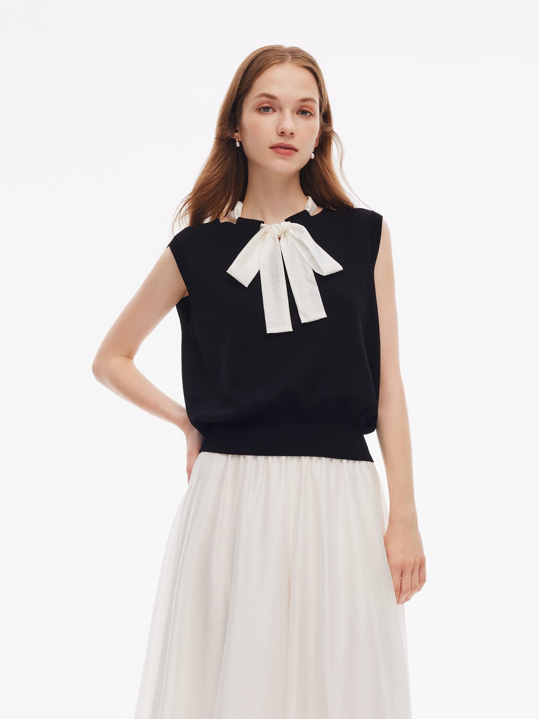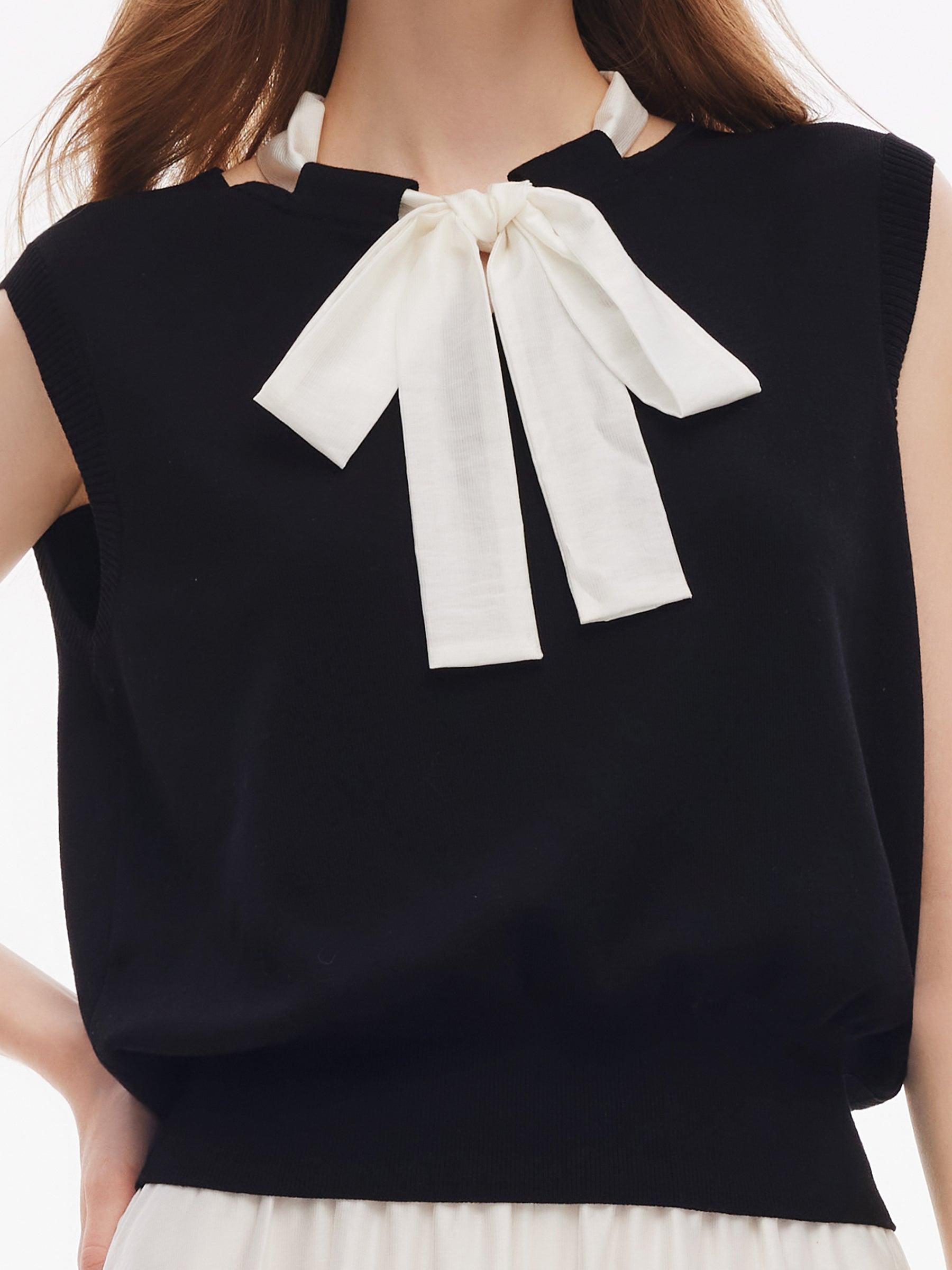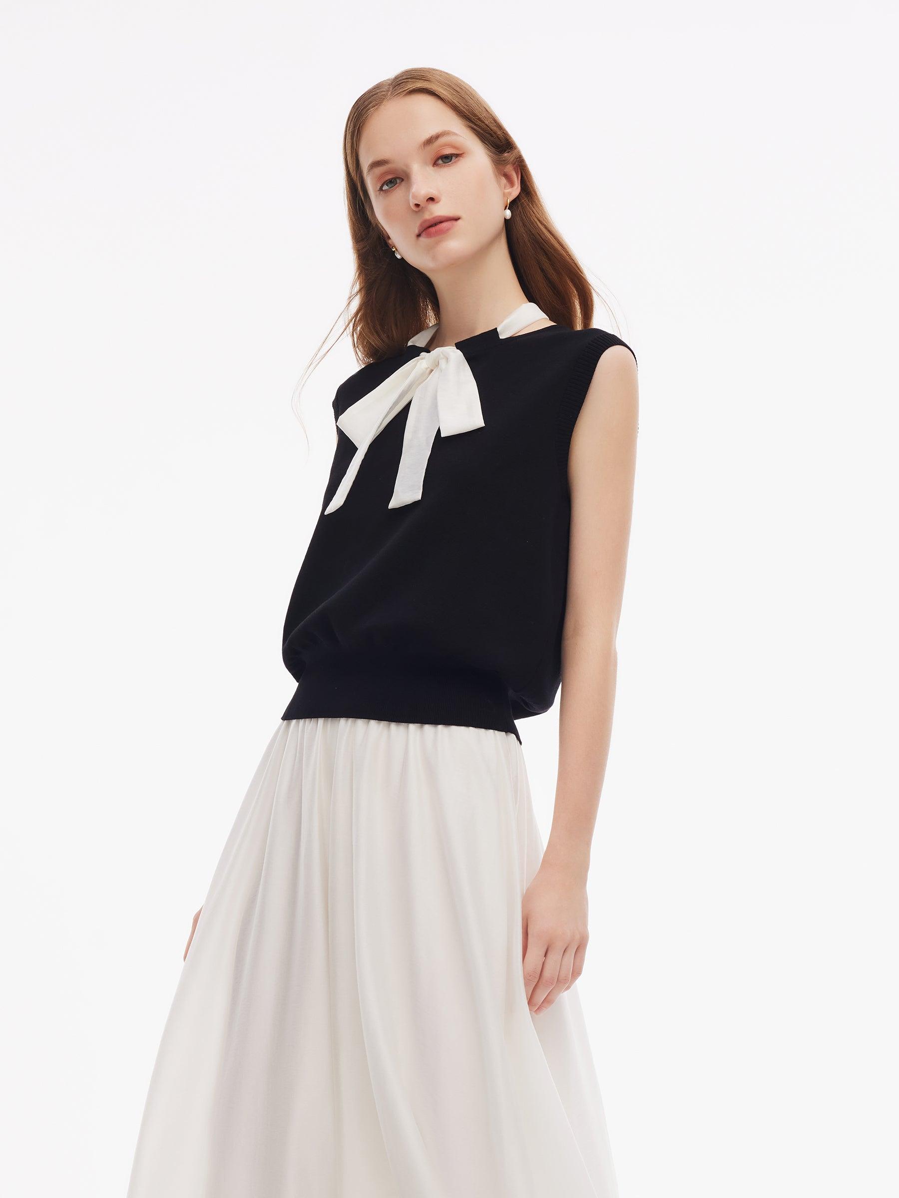 -Tencel blend fabric -With detachable scarf -Soft and comfortable Spun from a luxurious tencel blend, this knit tank top showcases a delicate open neckline and includes a matching scarf for versatile styling. A subtly gathered hem brings soft femininity, and the included scarf can be tied as a bow at the front or neck
