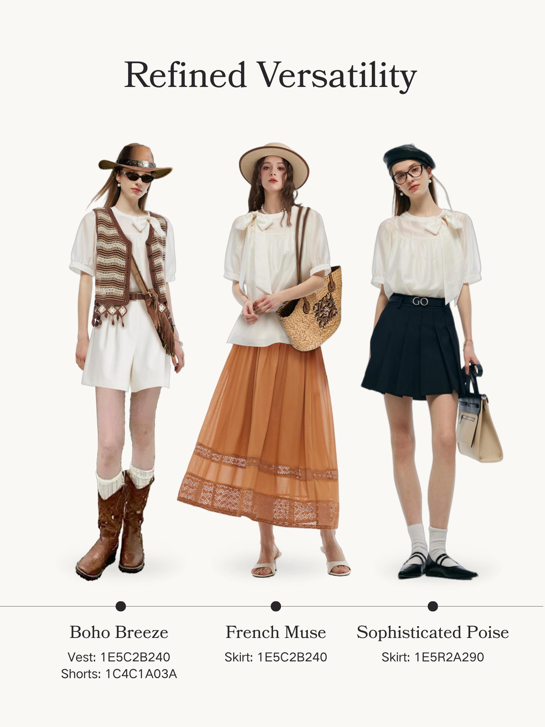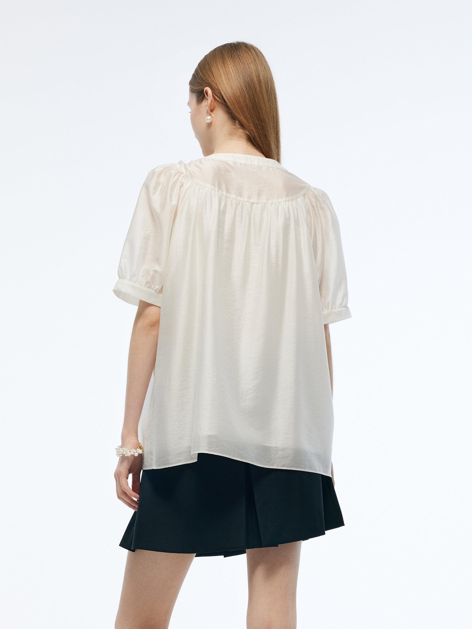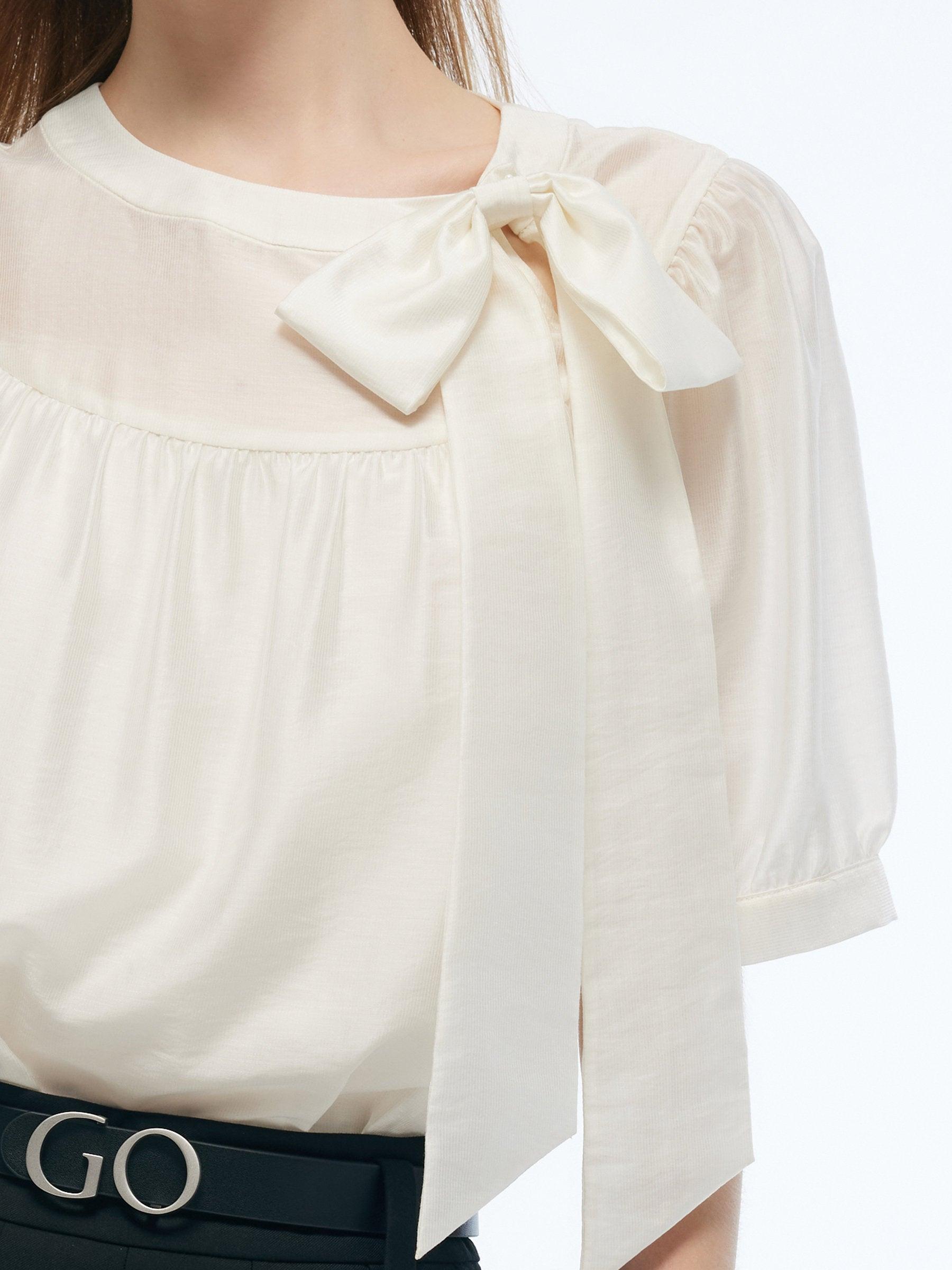 -Tencel blend fabric -Puff-sleeved design -With detachable bowknot Tailored from eco-friendly tencel blend fabric, this blouse offers exceptional comfort with a soft touch and moisture-wicking feel. The classic puff sleeves create a light, cloud-like silhouette, subtly shaping the arms. Featuring a loose fit for excell