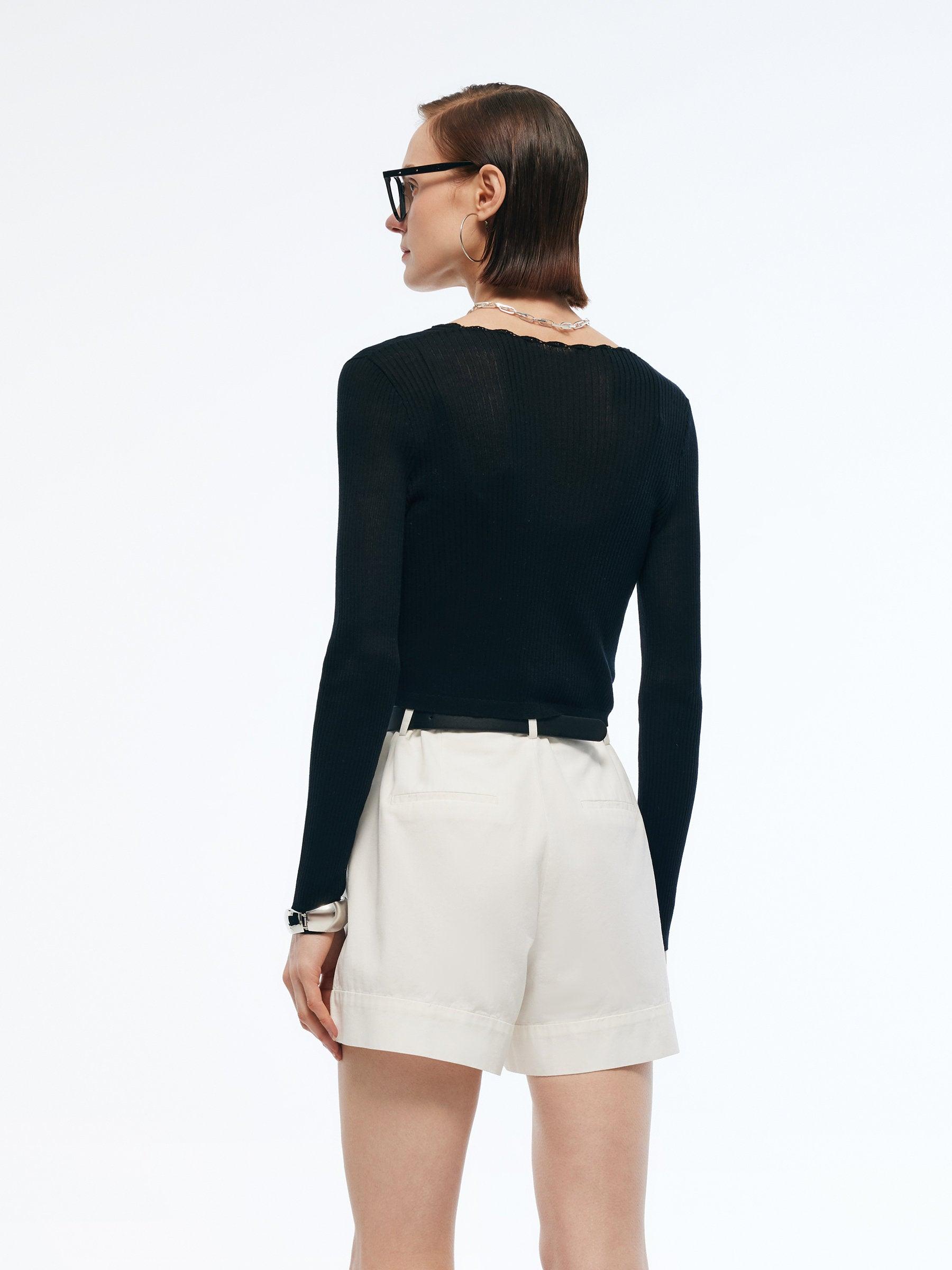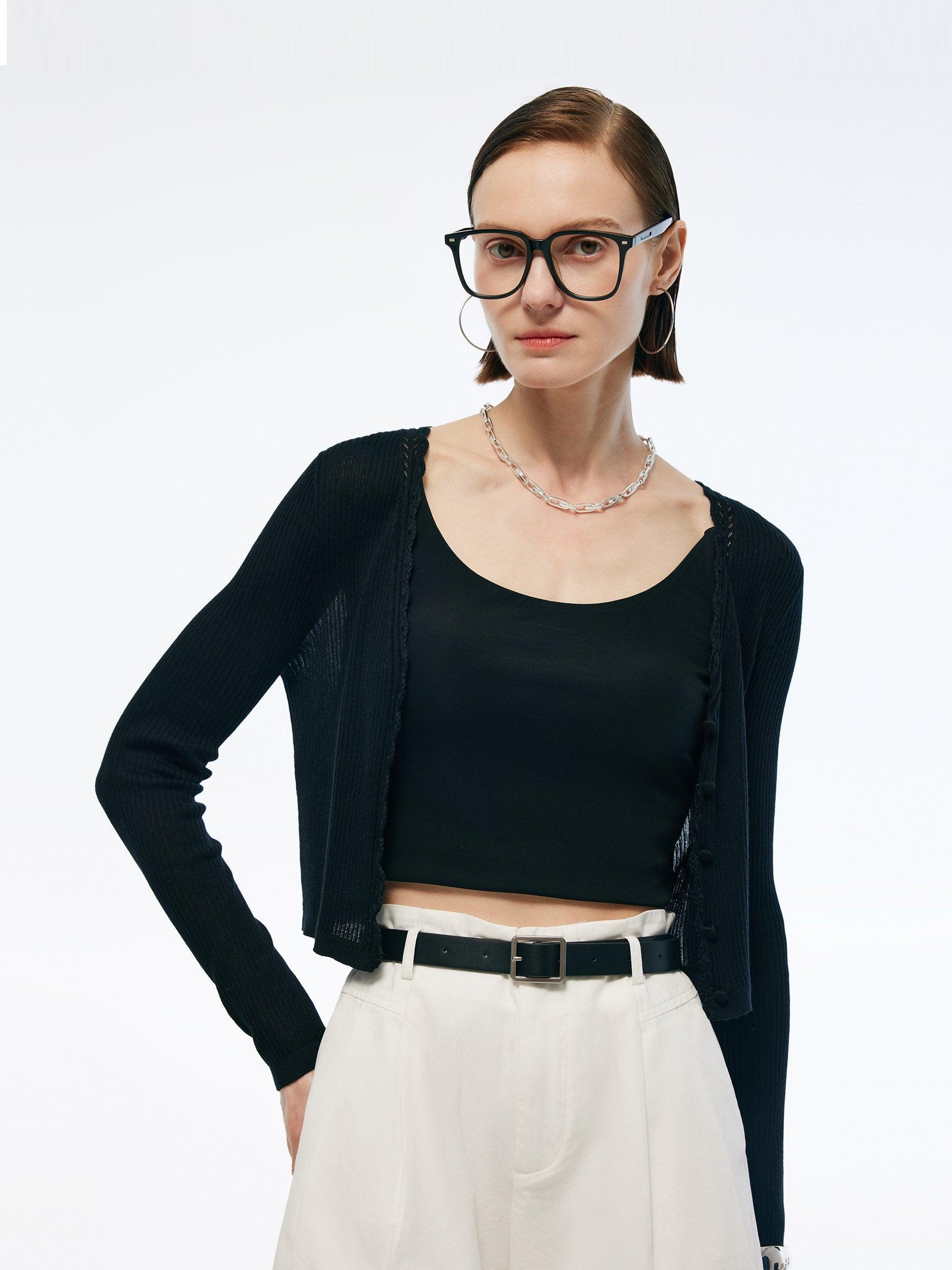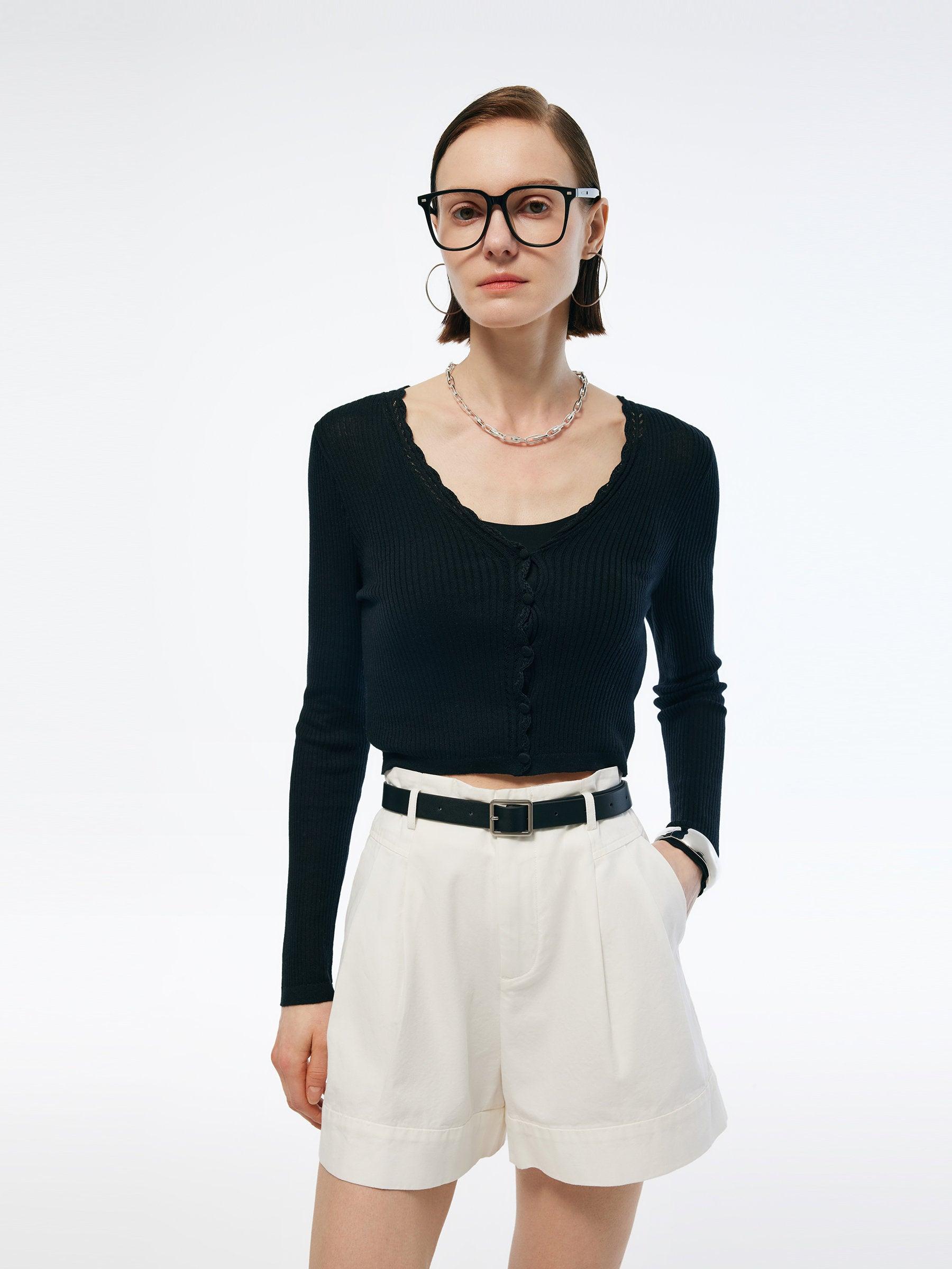 -Tencel and silk blend fabric -Elastic -Soft and comfortable Offered in fabric with a silky smooth touch and a lightweight feel, this tencel-silk blend cardigan features a classic silhouette with minimal design details which include delicate hand-crocheted trim and button placket. The elegant H-line silhouette flatters