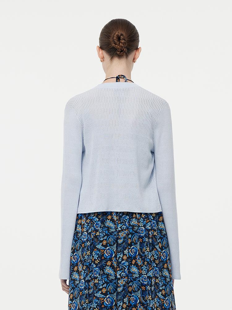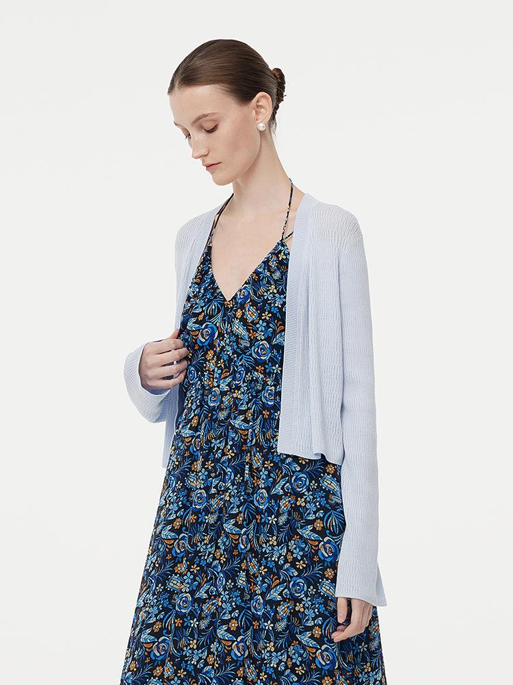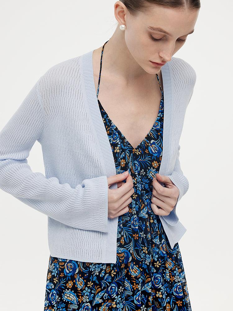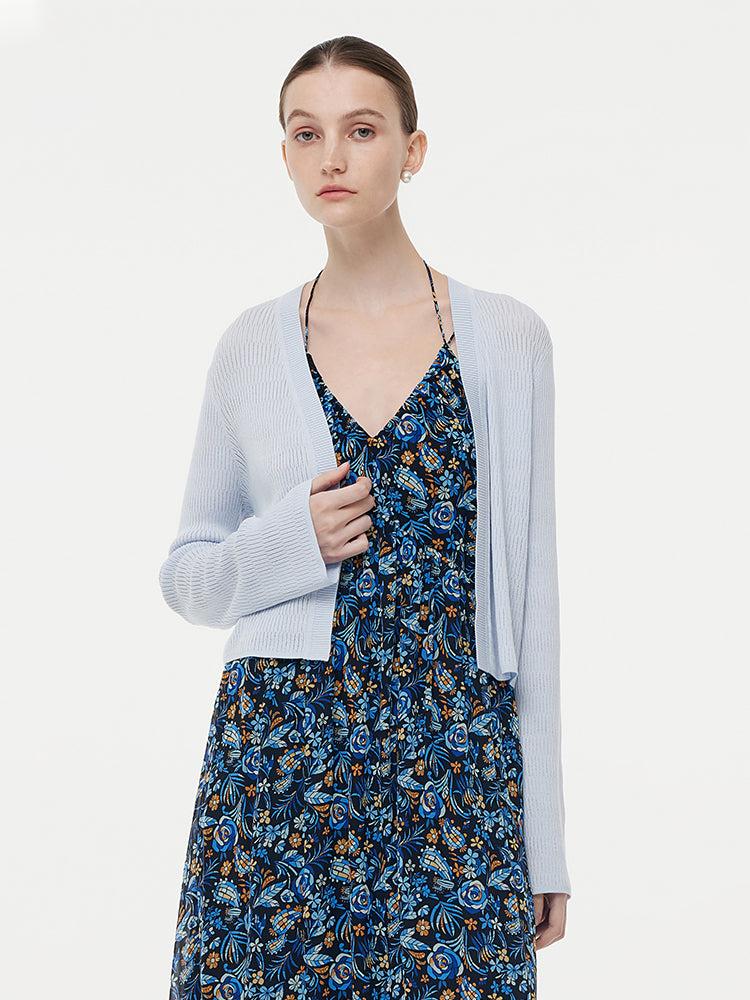 -Tencel -Elastic -Flare sleeves This cardigan, made from elastic Tencel fabric, offers a comfortable fit. Its flare sleeves add a stylish touch. With a refreshing color, it's perfect for spring and summer. It pairs beautifully with camisole dresses or camisoles, effortlessly combining comfort and fashion for the warm s
