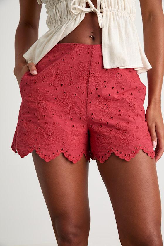 An adorable summer staple that's ready to adventure festival grounds and faraway vacays, these breezy cotton shorts feature a pierced eyelet-embroidered design and a high-rise fit. Diagonal front pockets accent the figure-skimming silhouette that finishes with scalloped hems for a vintage-inspired effect. Hidden back zipper/clasp.