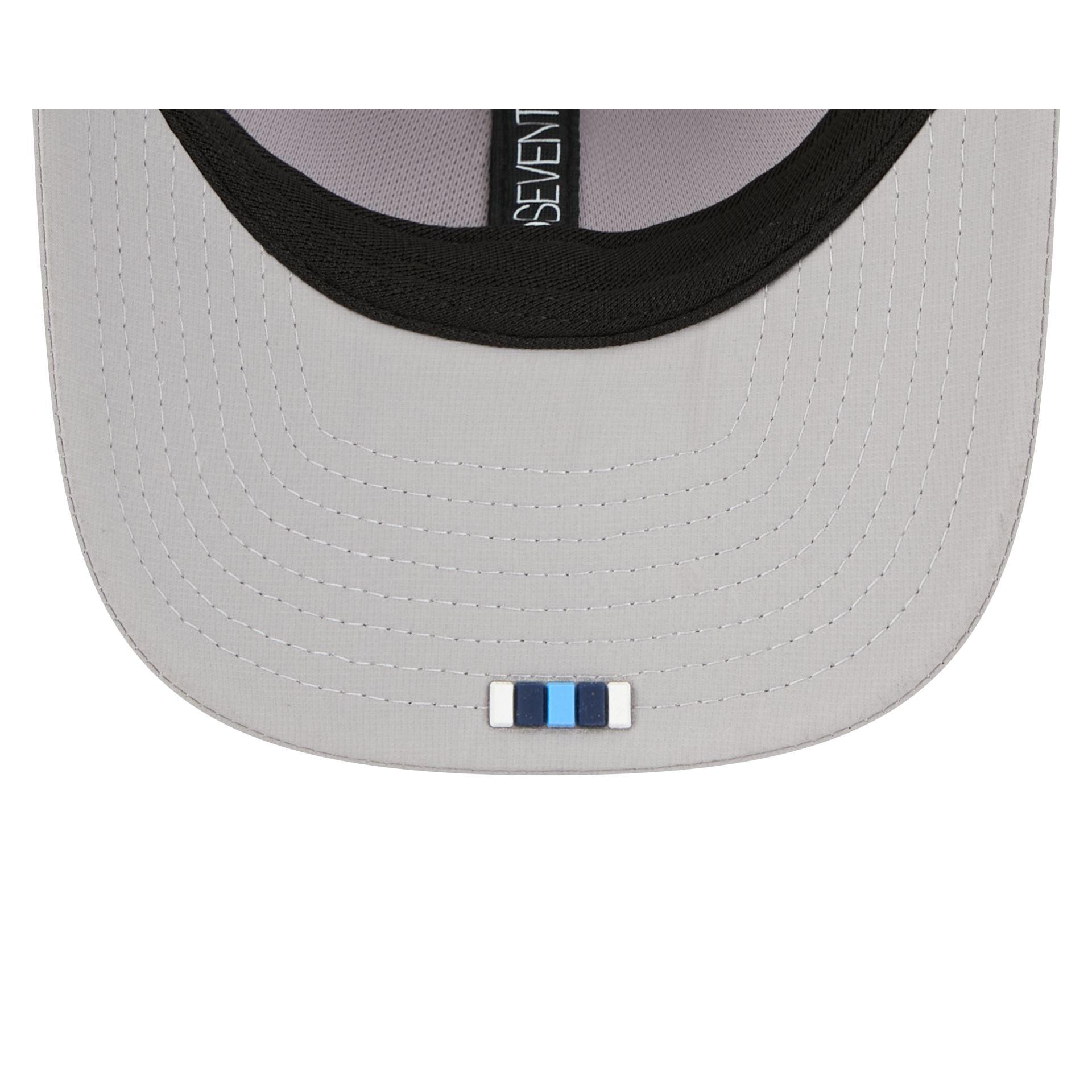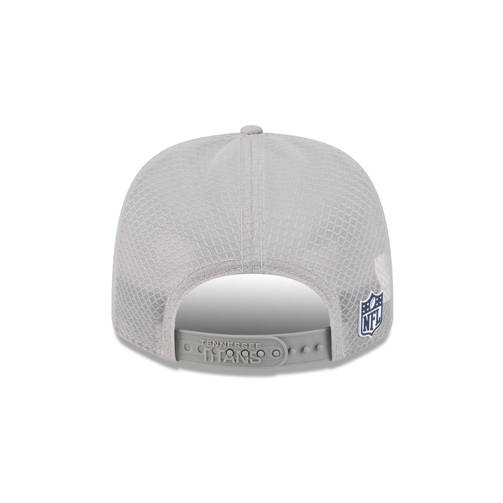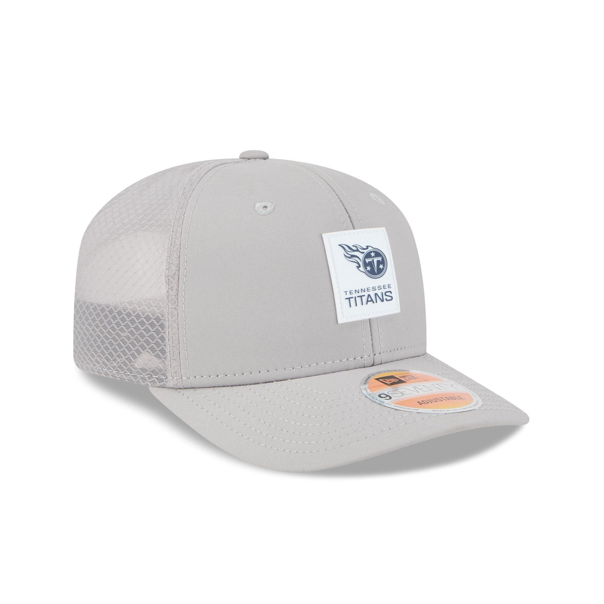 The Tennessee Titans 2025 Sideline Hot Weather Gray 9SEVENTY Trucker features a sewn-down silicone Titans logo patch at the front panels with a water-repellent quill tech fabrication throughout and a quick-dry cushioned sweatband to absorb moisture. Additional details include the Official NFL Shield logo to the right of a soft silicone snapback closure at a light-weight mesh rear. The undervisor is accented with a silicone transfer in the team’s colors.