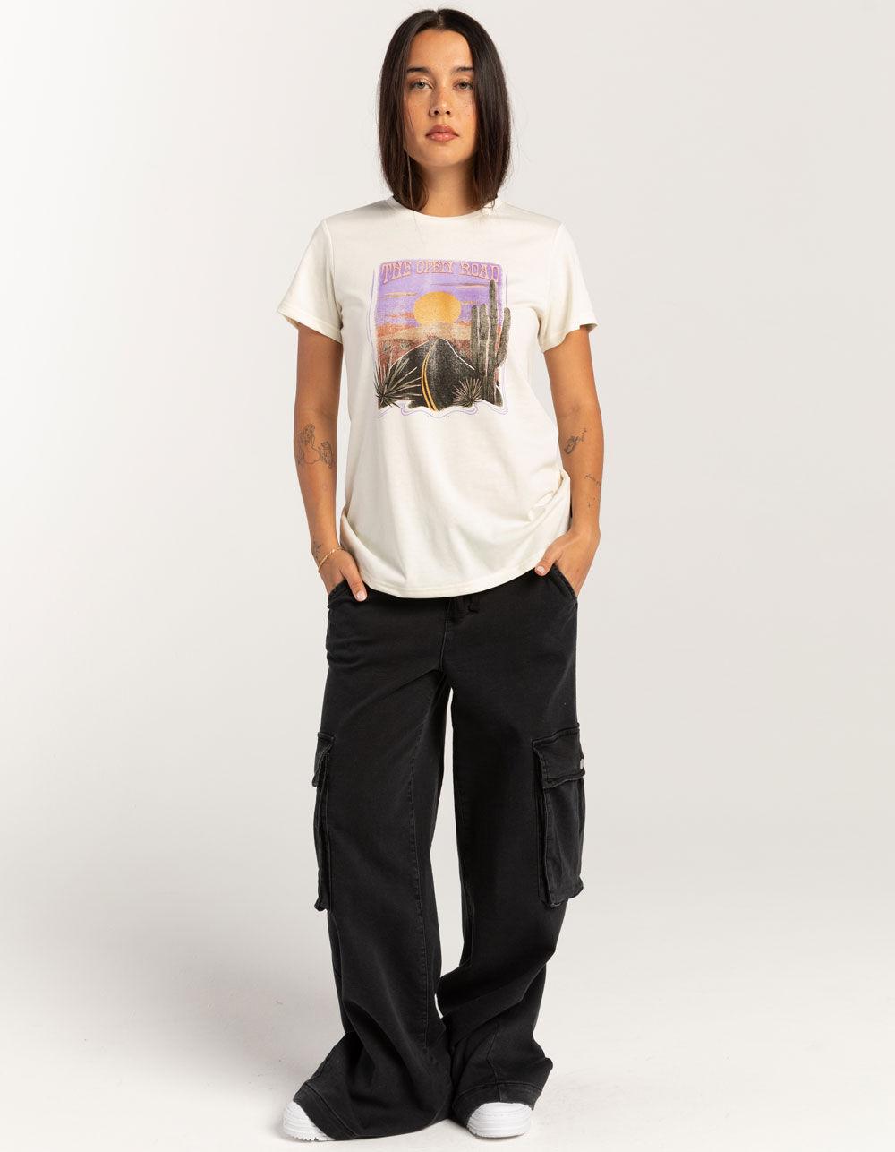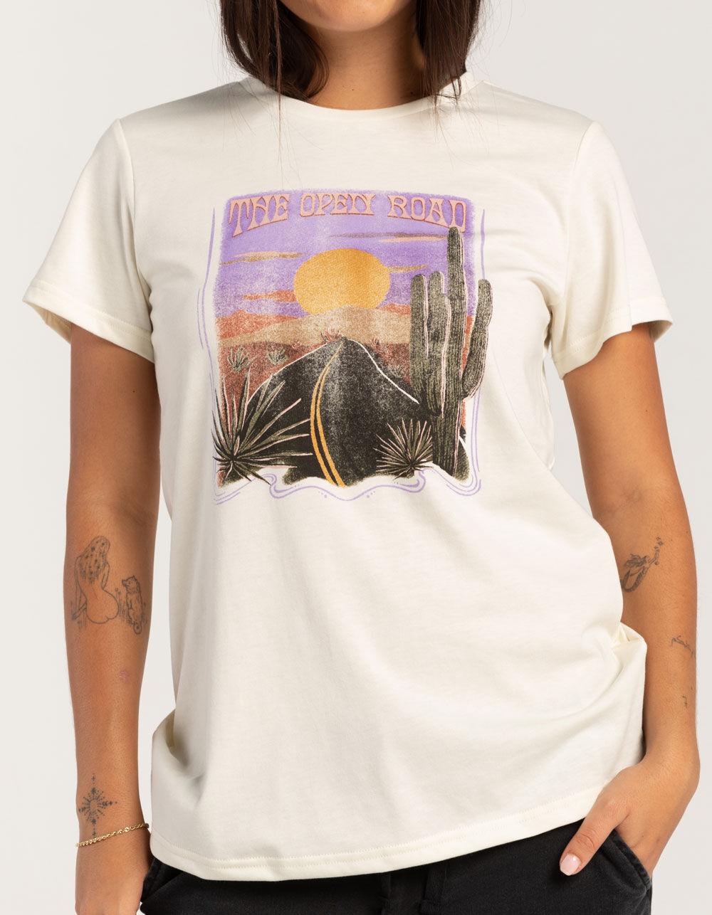 OFF WHITE. Tentree Open Road Tee. Escape the everyday and hit the road less traveled with this Open Road T-Shirt — made with a planet-friendly blend of super soft fibers. Set-in short sleeves. Crew neck. Ribbed neckline. Water based and platisol ink screen printed graphic on CF Body. Medium 2-way stretch knit fabric. Super soft handfeel. 60% Recycled Cotton, 40% REPREVE® Our Ocean® Recycled Polyester. Machine wash. Imported.