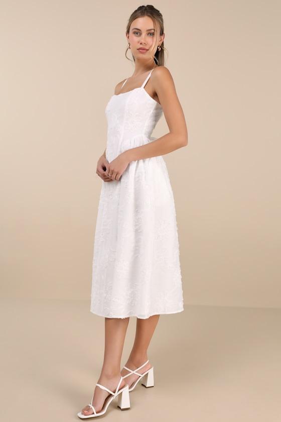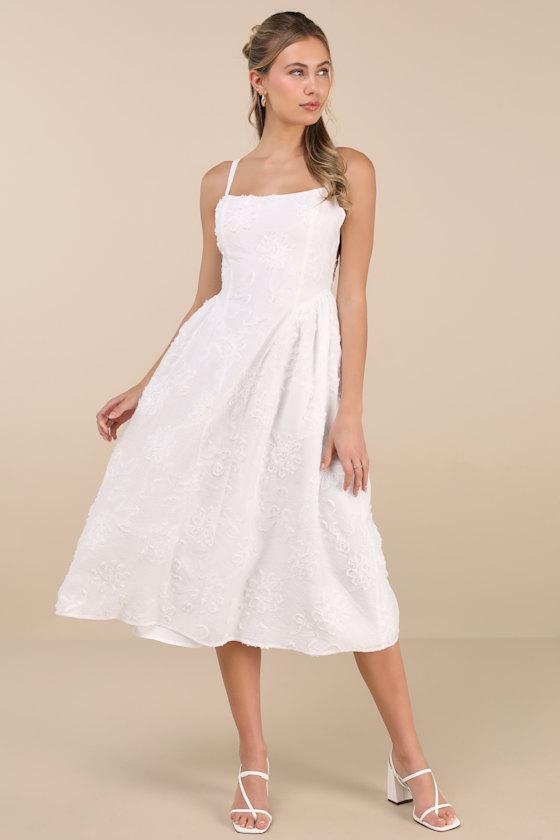 Princess-worthy attention follows this textured, woven dress that boasts intricate floral appliques across the midi silhouette. Adjustable straps support a subtle scoop neckline and a seamed bodice with gathered panels at the sides of the waist, all atop a full A-line skirt. A lace-up design at the back creates a romantic finish that will make everyone swoon. Hidden back zipper/clasp.