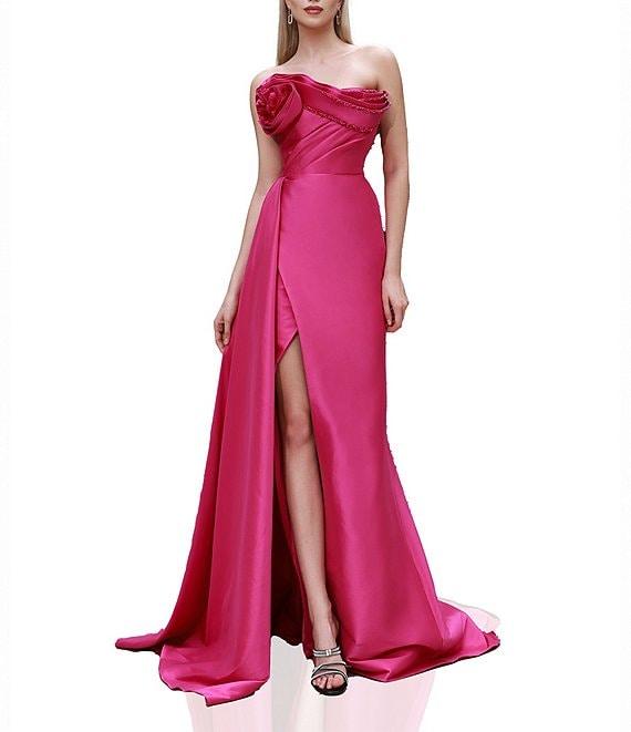 From Terani Couture, this gown features:Sheath silhouetteStretch mikado fabricationStrapless3D Floral appliqueSleevelesssWaist seam with draping detailFront slitZip back closureLinedApprox. 62" length PolyesterDry cleanImported.