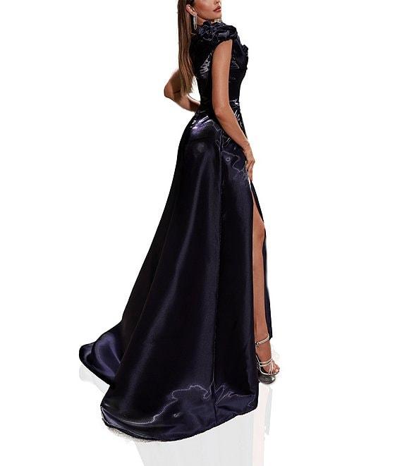 From Terani Couture, this dress features: Shimmer organza fabrication A-line silhouette Off-the-shoulder neckline with 3D flowers Princess seams Front slit Zip back closure Lined Approx. length 62.5" Polyester Hand wash Imported.