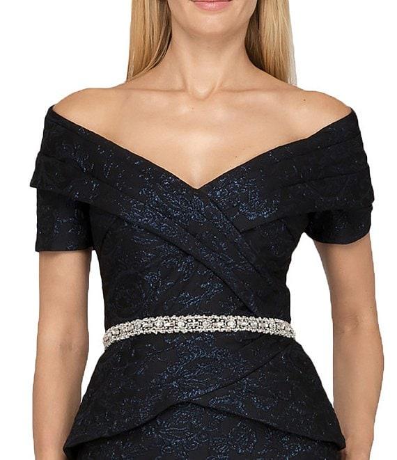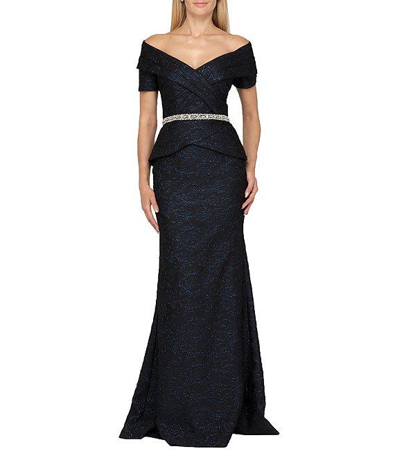 From Terani Couture, this gown features: Mermaid silhouette Portrait neckline Off-the-shoulder sleeves Beading and jeweled detail at waist Fully lined Invisible center back zip closure Approx. 48" length from waist If between sizes, size up Polyester Dry clean Imported.