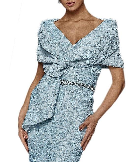 From Terani Couture, this gown features: allover brocade fabrication mermaid asilhouette V-neckline short sleeves twisted shawl included if between sizes, size up fully lined center back zip closure approx. 48" length from waist polyester dry clean Imported.