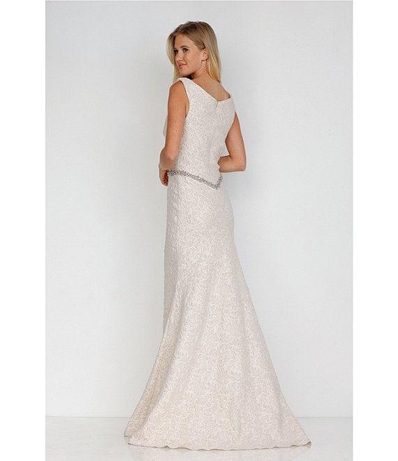 From Terani Couture, this gown features:allover brocade fabricationmermaid asilhouette V-necklineshort sleevestwisted shawl includedif between sizes, size upfully linedcenter back zip closureapprox. 48" length from waist polyesterdry clean Imported.