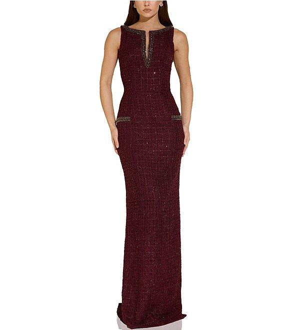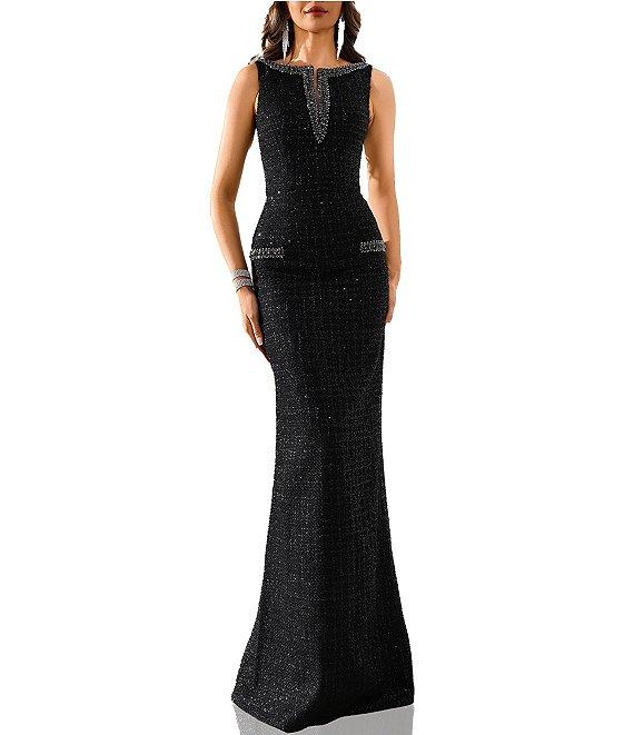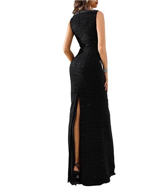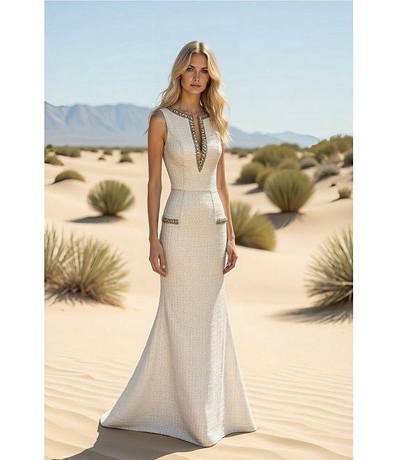 Terani Couture Embellished Boat Neck Sleeveless Tweed Column Gown