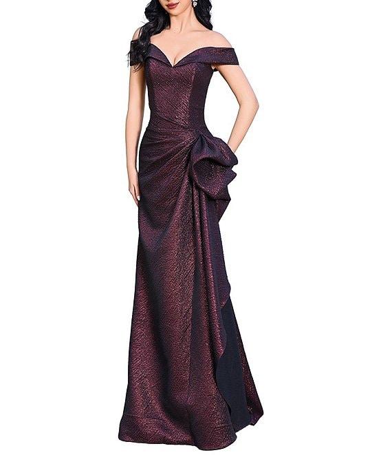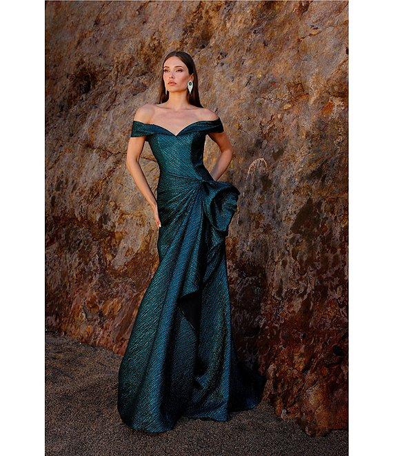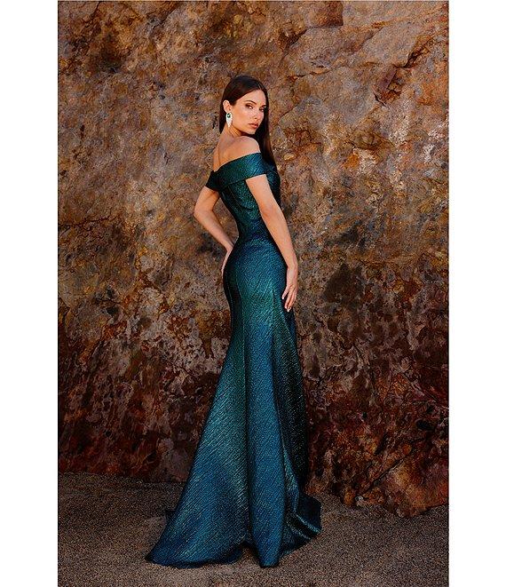 From Terani Couture, this dress features: Foil jacquard fabrication Mermaid silhouette Off the shoulder neckline Sleeveless Side ruffle Zip back closure Approx. 46" length Polyester Dry clean Imported.