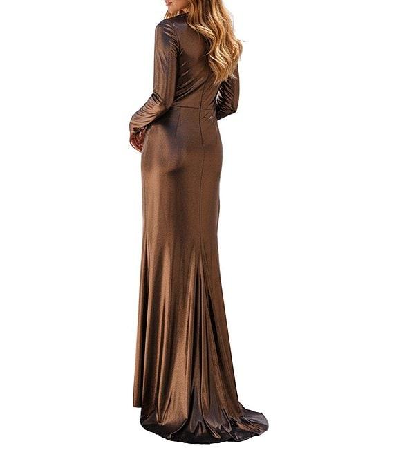 From Terani Couture, this dress features: Foiled fabrication Sheath silhouette V neckline Long sleeves Front ruching Zip back closure Approx. 46" length Polyester Dry clean Imported.