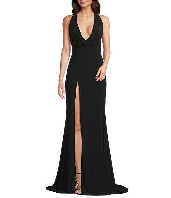 From Terani Couture, this gown features:Column gown silhouetteKnit jersey fabricationHalter necklineSleevelessFront slitZip back closureLinedApprox. 62" length PolyesterDry cleanImported.