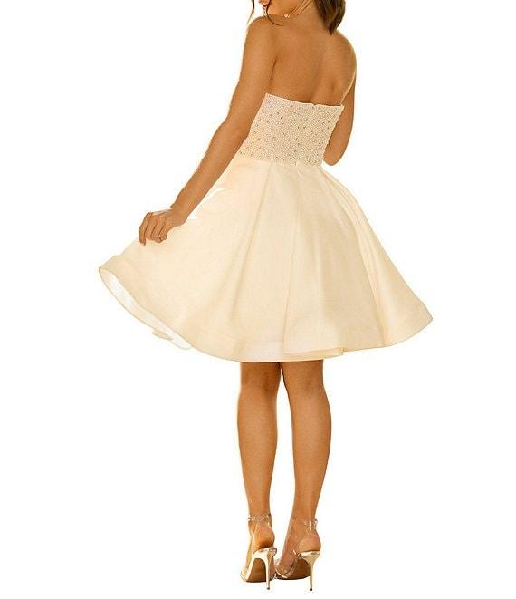 From Terani Couture, this dress features: Matte satin fabrication A line silhouette Strapless neckline Sleeveless Beaded bodice Zip back closure Approx. 36" length Polyester Dry clean Imported.
