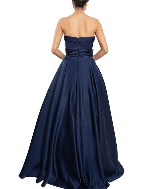 From Terani Couture, this gown features: Matte satin fabrication Ball gown silhouette Strapless v-neckline Sleeveless Side seam pockets Front bow detail Fully lined Flutter hemline Center back zipper closure Approx. 48" length Polyester Dry clean Imported.