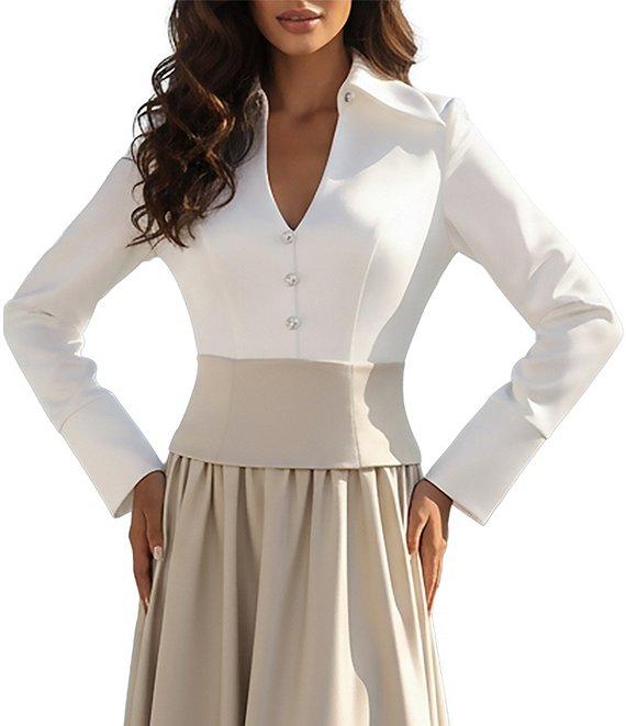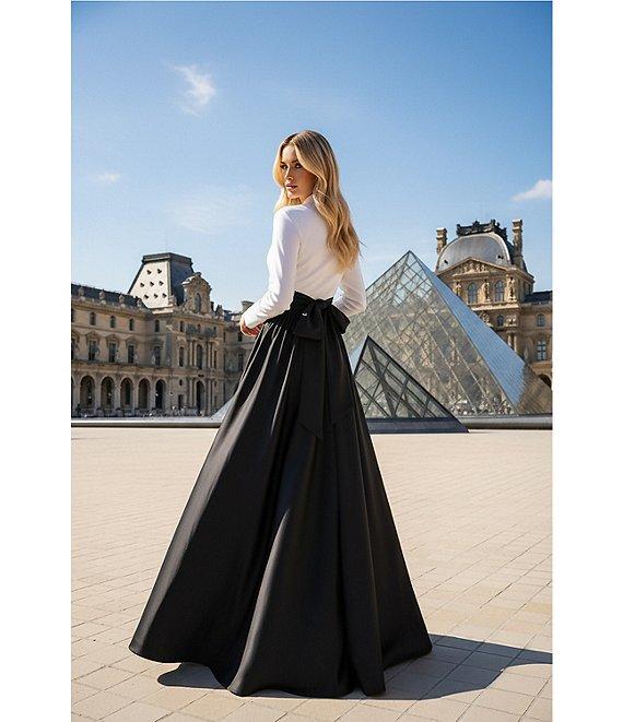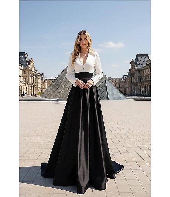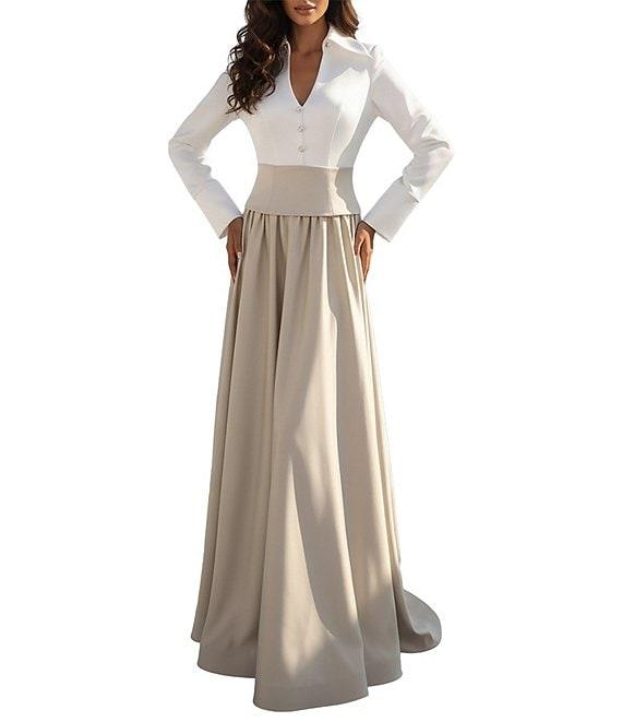 Terani Couture Matte Satin Two Tone Collard V-Neck Long Sleeve A-Line Gown