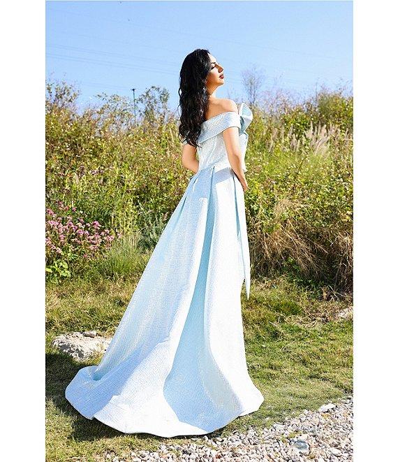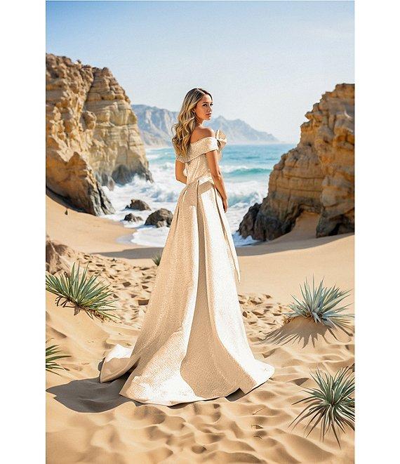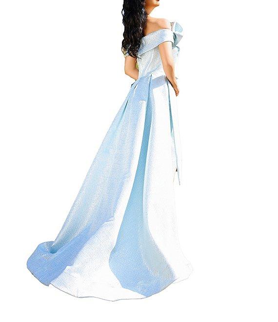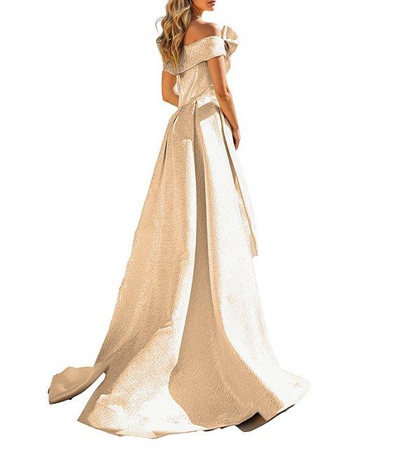 Terani Couture Metallic Jacquard Off-The-Shoulder Ruffle Overskirt A-Line Gown
