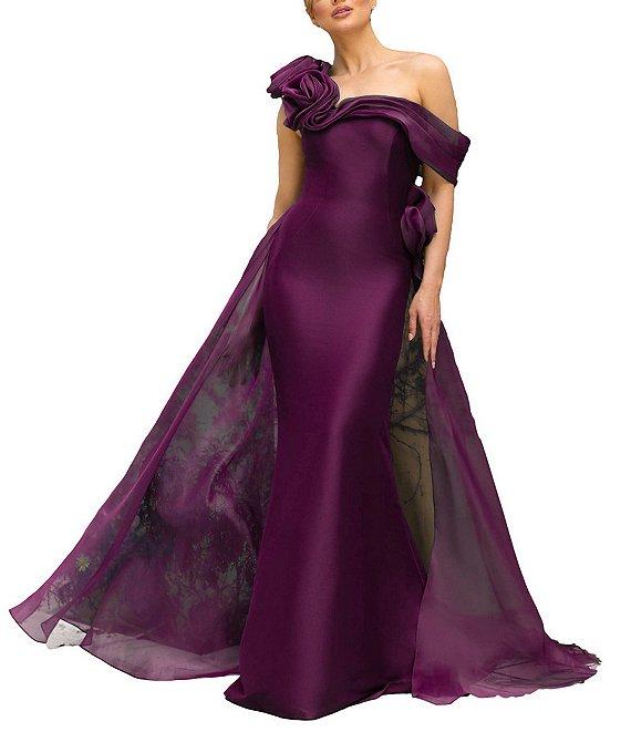From Terani Couture, this dress features: Mikado fabrication One shoulder neckline Rosette applique detail Cape train detail Back zip closure Approx. 48" length Polyester Dry clean Imported.
