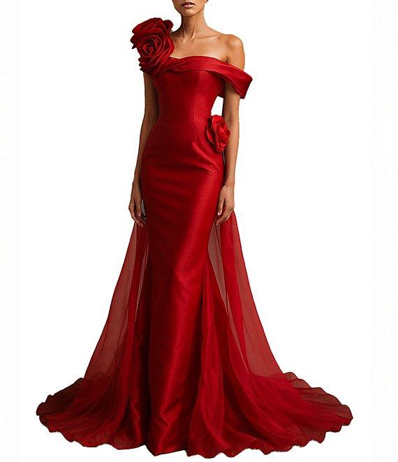 Terani Couture Mikado One Shoulder Rosette Applique Train Gown