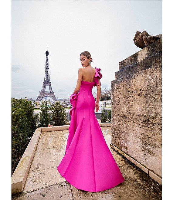 Terani Couture Mikado One Shoulder Ruffle Sleeve Sequin Applique Gathered Side Slit Gown