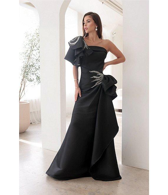 From Terani Couture, this dress features: Mikado fabrication One shoulder neckline Flutter Sleeve Sequin applique detail Over sized gather detail Side slit Back zip closure Approx. 48" length Polyester Dry clean Imported.