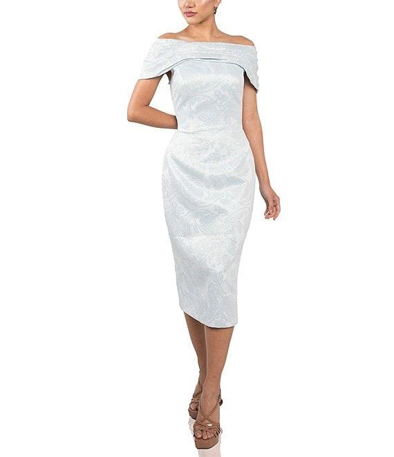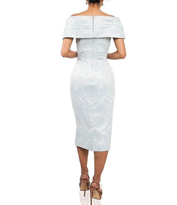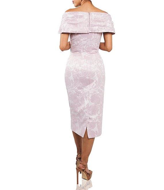 Terani Couture Off-the-Shoulder Brocade Sheath Midi Dress