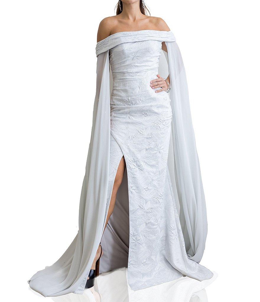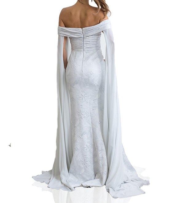 This dress from Terani Couture features:Floral jacquard fabricationColumn gown silhouetteOff-the-shoulder necklineChiffon cap sleevesSide ruching at bodiceTulip skirt with side slitLinedZip back closureApprox. 62.5" lengthPolyesterProfessionally dry cleanImported.