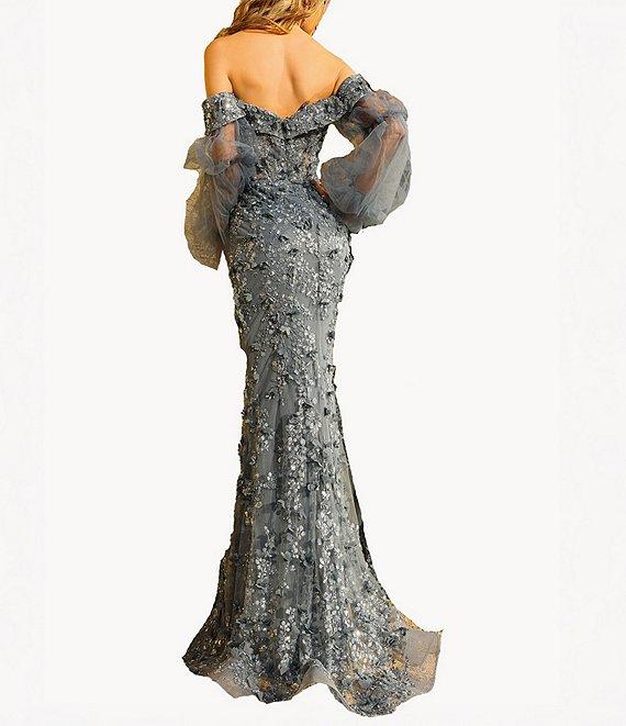 Terani Couture Off-The-Shoulder Long Sleeve 3D Flowers Gown