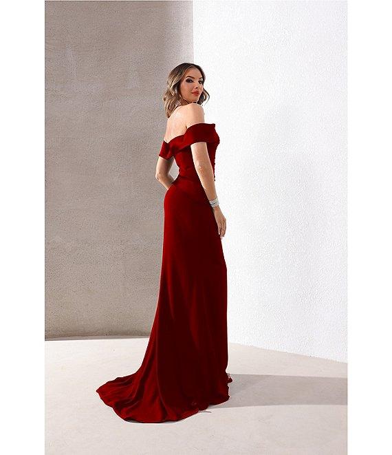 Terani Couture Off The Shoulder Pleated Bodice Crepe Mermaid Gown