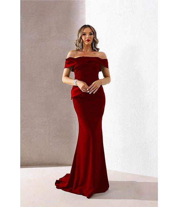 From Terani Couture, this gown features: Mermaid silhouette Crepe fabrication Off the shoulder neckline Cap sleeves Pleated bodice Small train Zip back closure Lined Approximate length 62" Polyester Dry clean Imported.