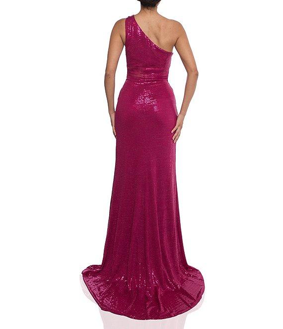 From Terani Couture, this dress features: Sequin fabrication Sheath silhouette One shoulder neckline Sleeveless Open front Side embellishments Lined Zip back closure with hook n eye Approx. 46" length from waist Polyester Dry clean Imported.