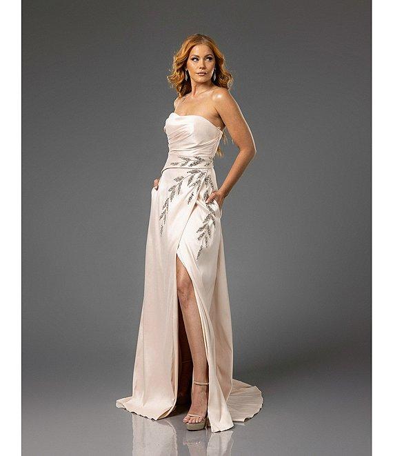 From Tadashi Shoji, this gown features: A-line silhouette Satin fabrication Strapless Ruched bodice Beaded leaf motif Front slit Zip back closure Lined Approximate length 61" Polyester Hand wash Imported.
